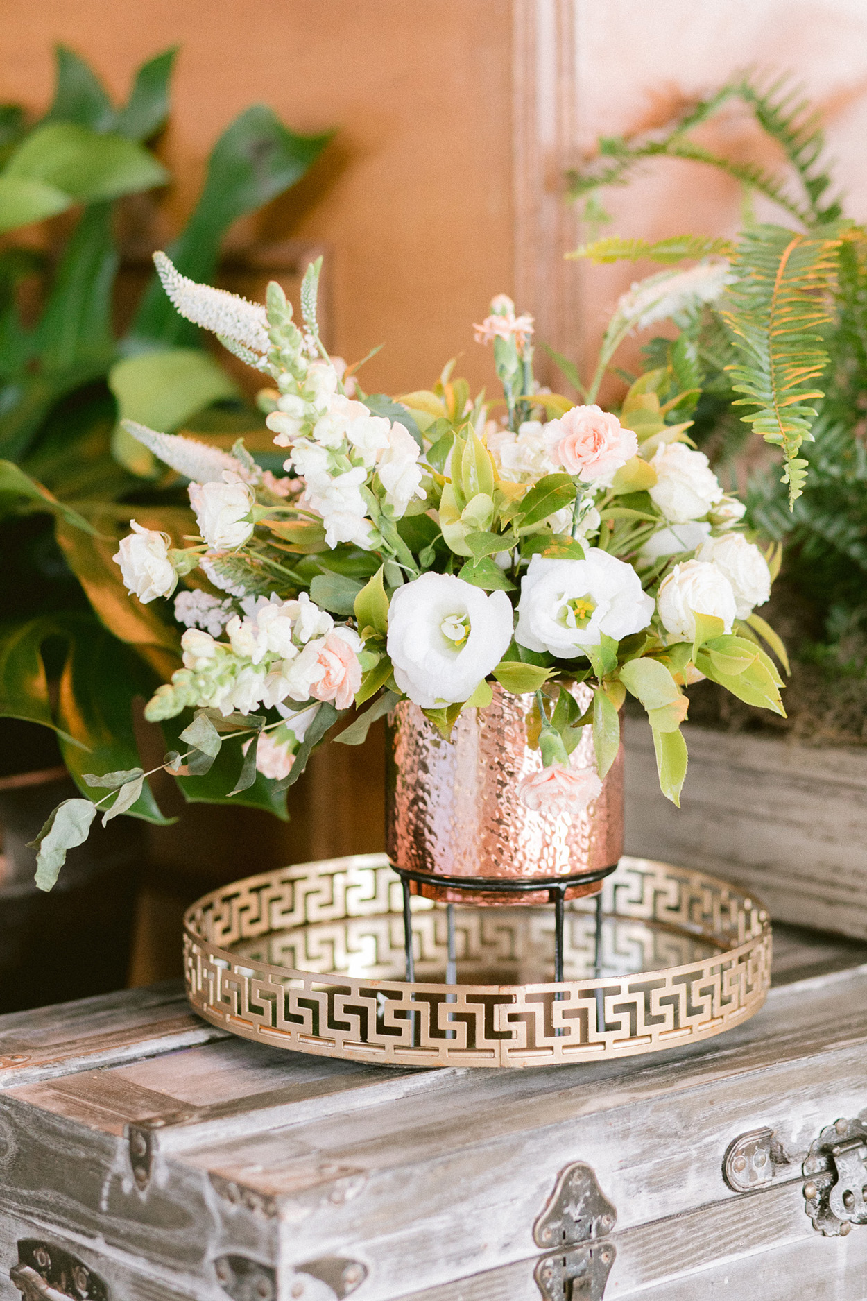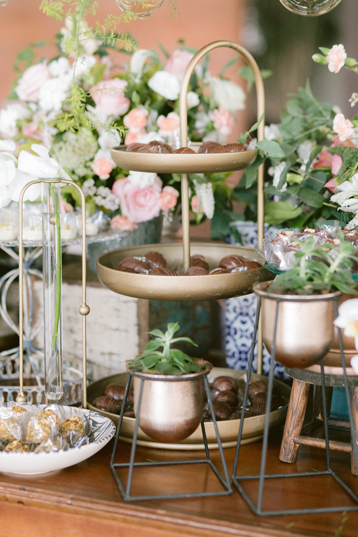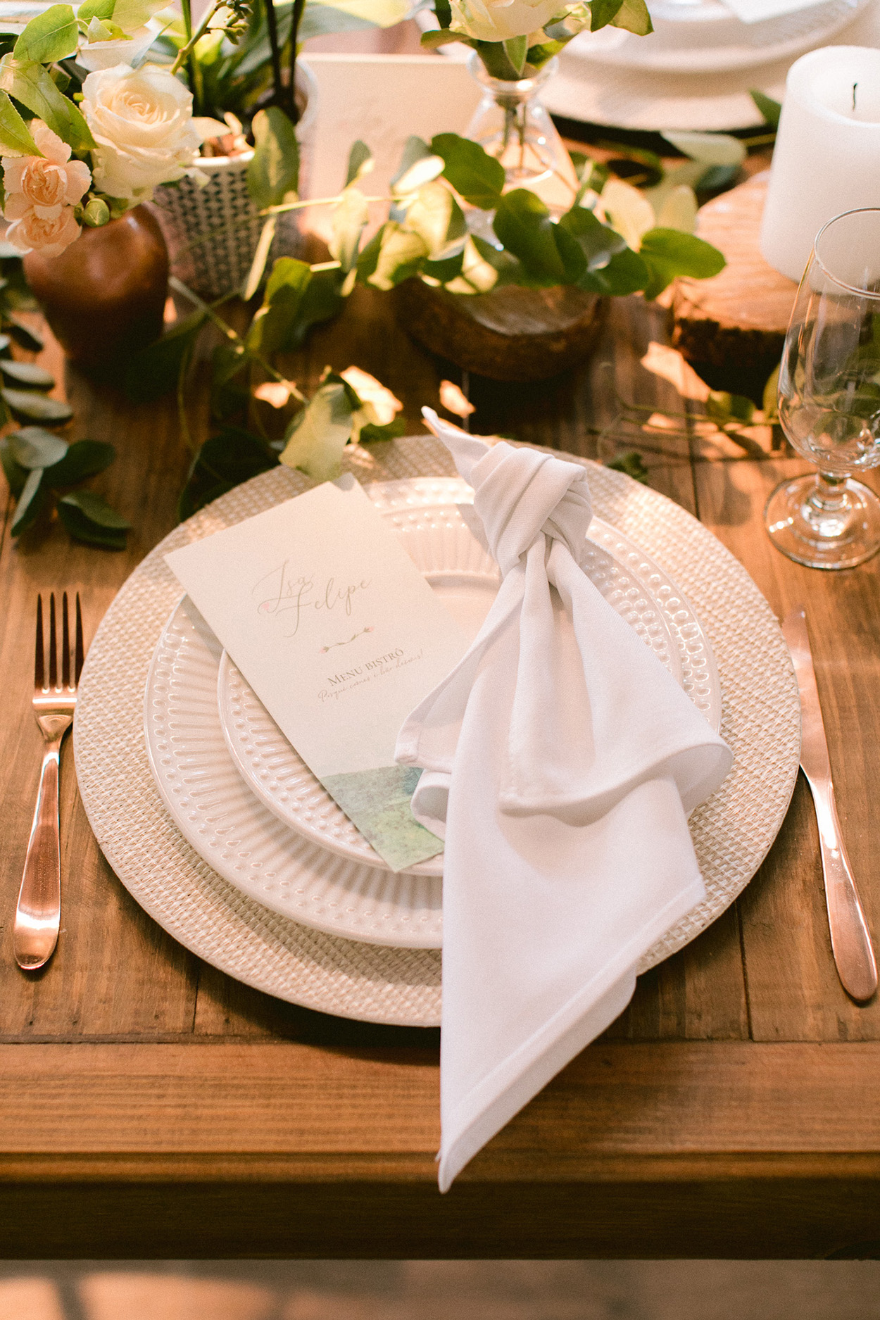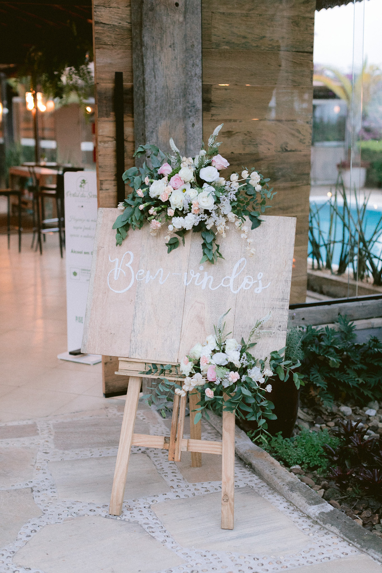 A decoração com folhagens naturais tinham flores com cores delicadas e sóbrias. Madeira rústicas combinando com peças e elementos em cobre, algumas velas delicadas, além de frases do soneto de fidelidade em diversos elementos.