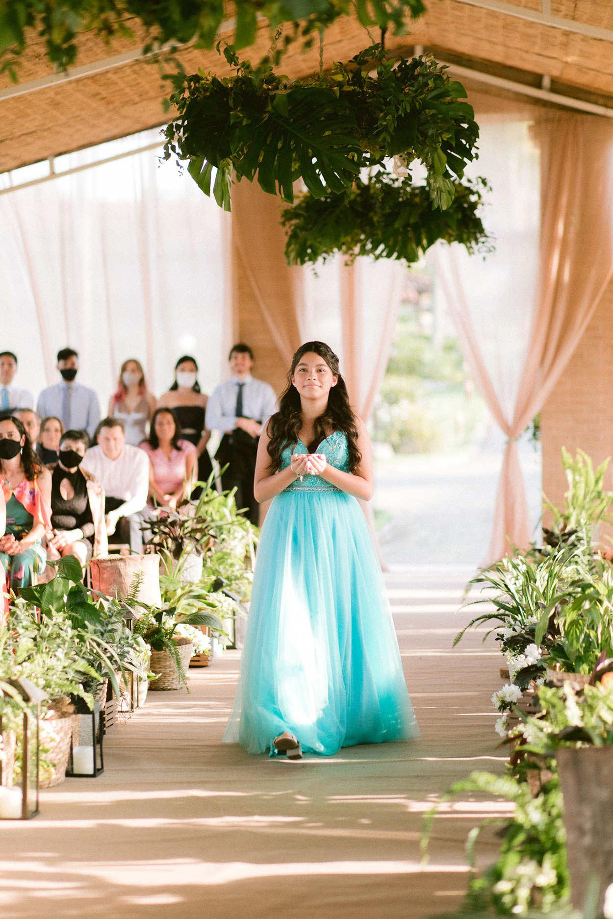 Com essa ideia no coração, o grande dia aconteceu no campo com cenários e elementos que contrastavam da natureza rústica com a beleza delicada.