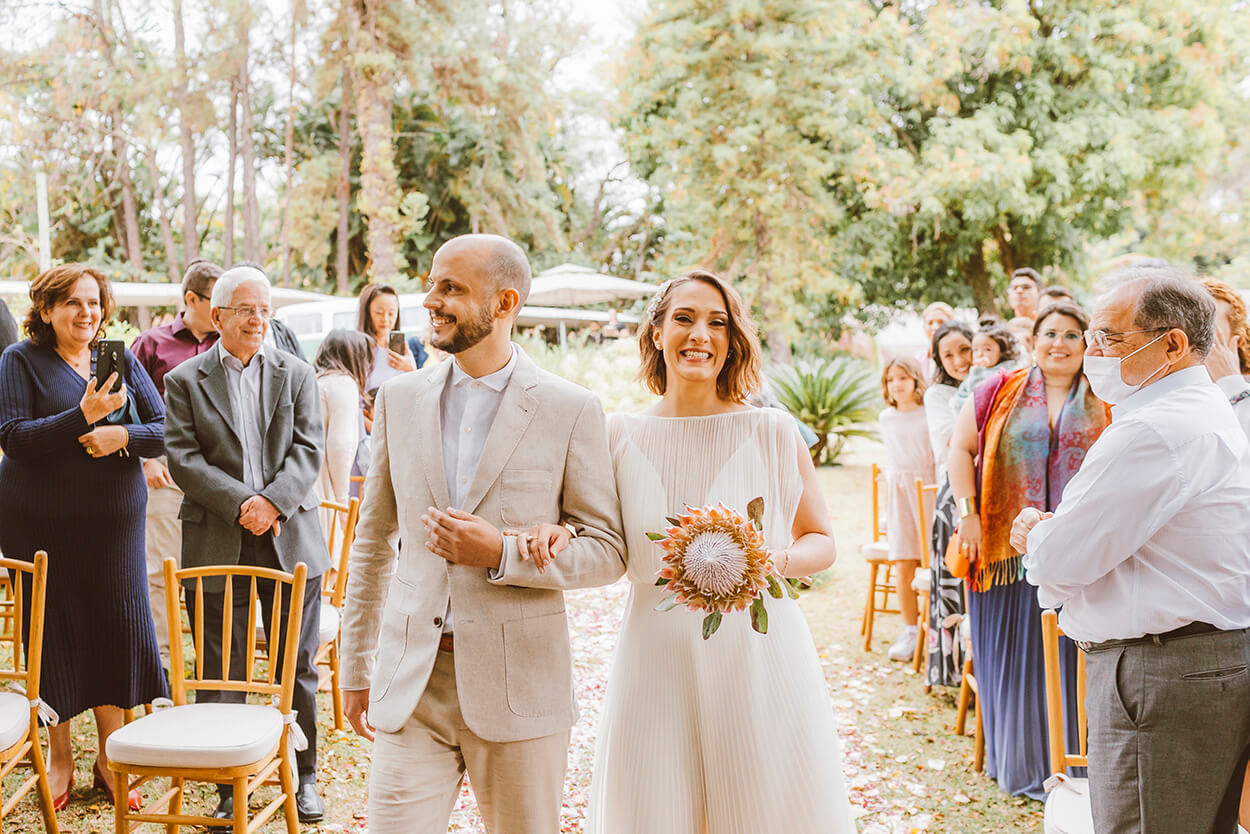 O casal conta que não são pessoas muito noturnas e que adoram a luz do dia e, claro, longos cafés da manhã! Para combinar com essa atmosfera, noiva escolheu um vestido bem fluido que aposta na transparência, decote e drapeado para chamar a atenção de forma bem elegante. Já o buquê foi só com ela: a Protea.
