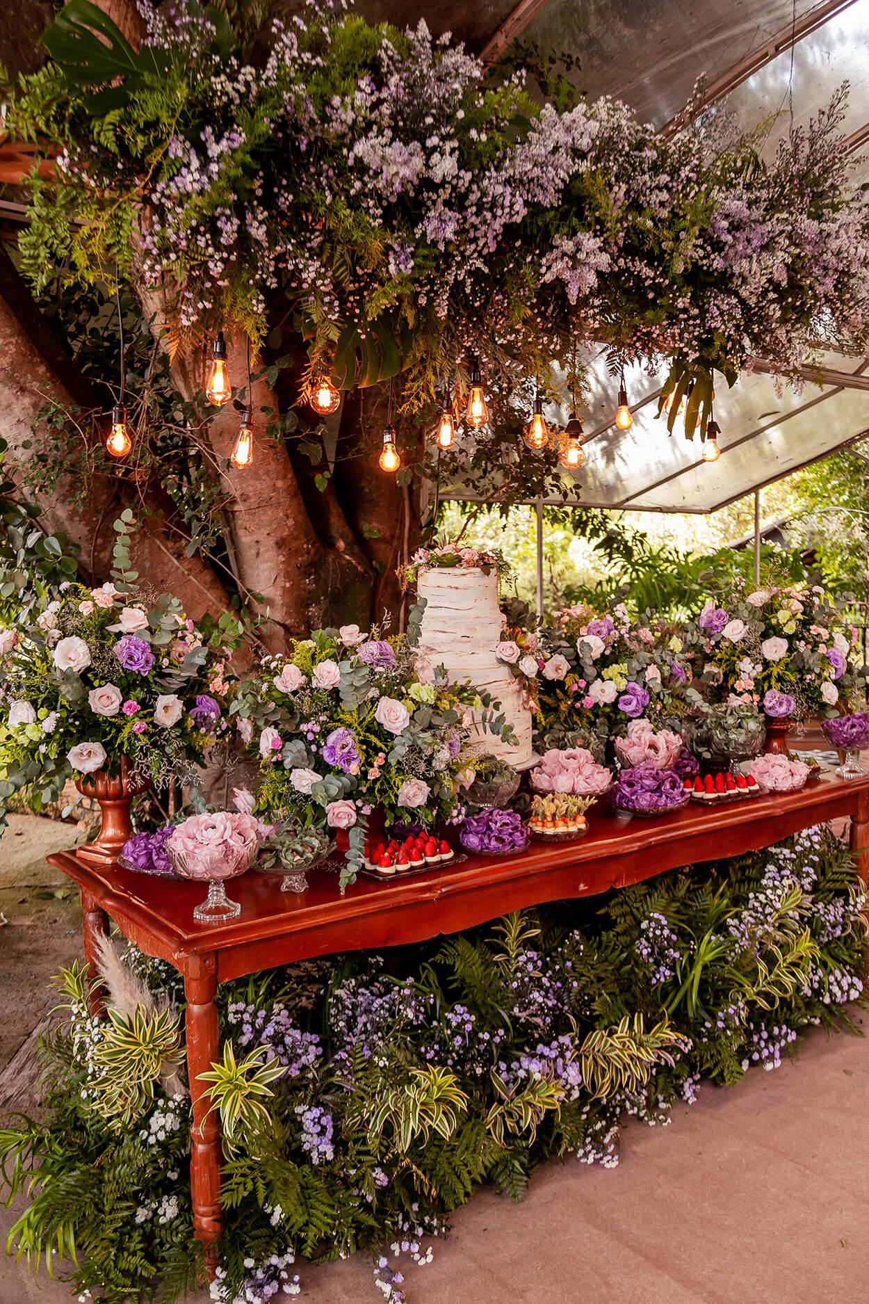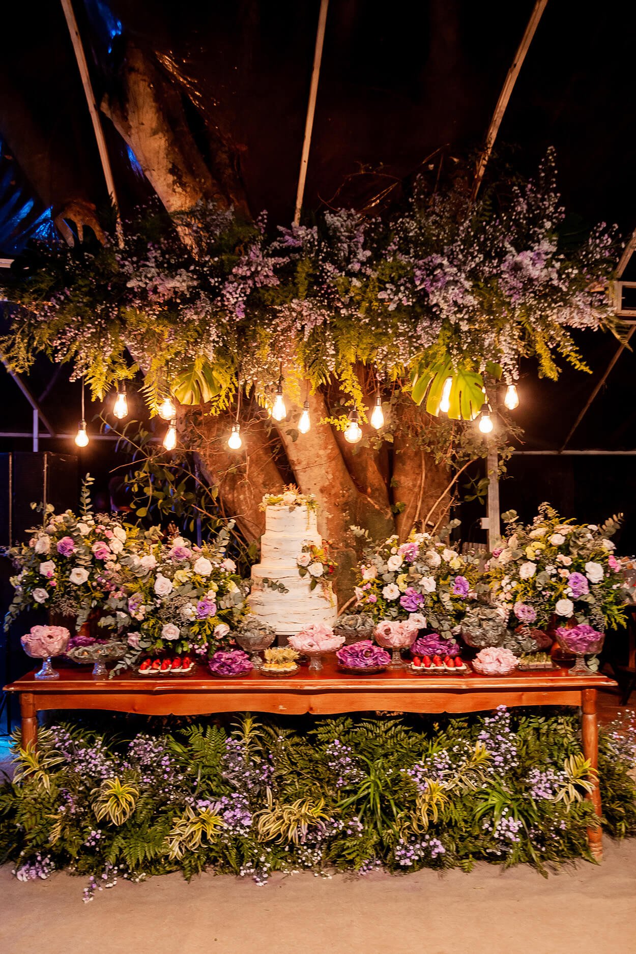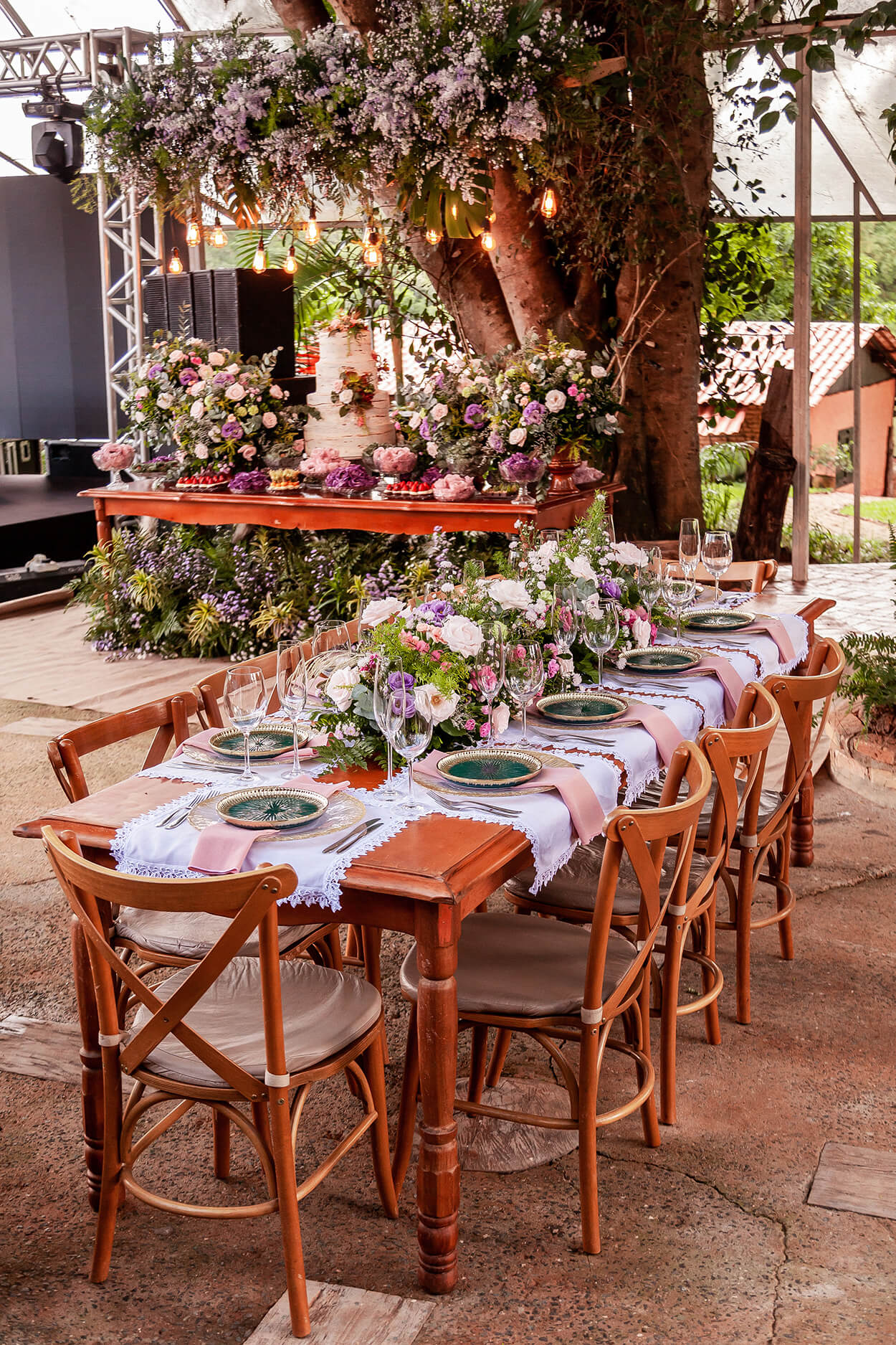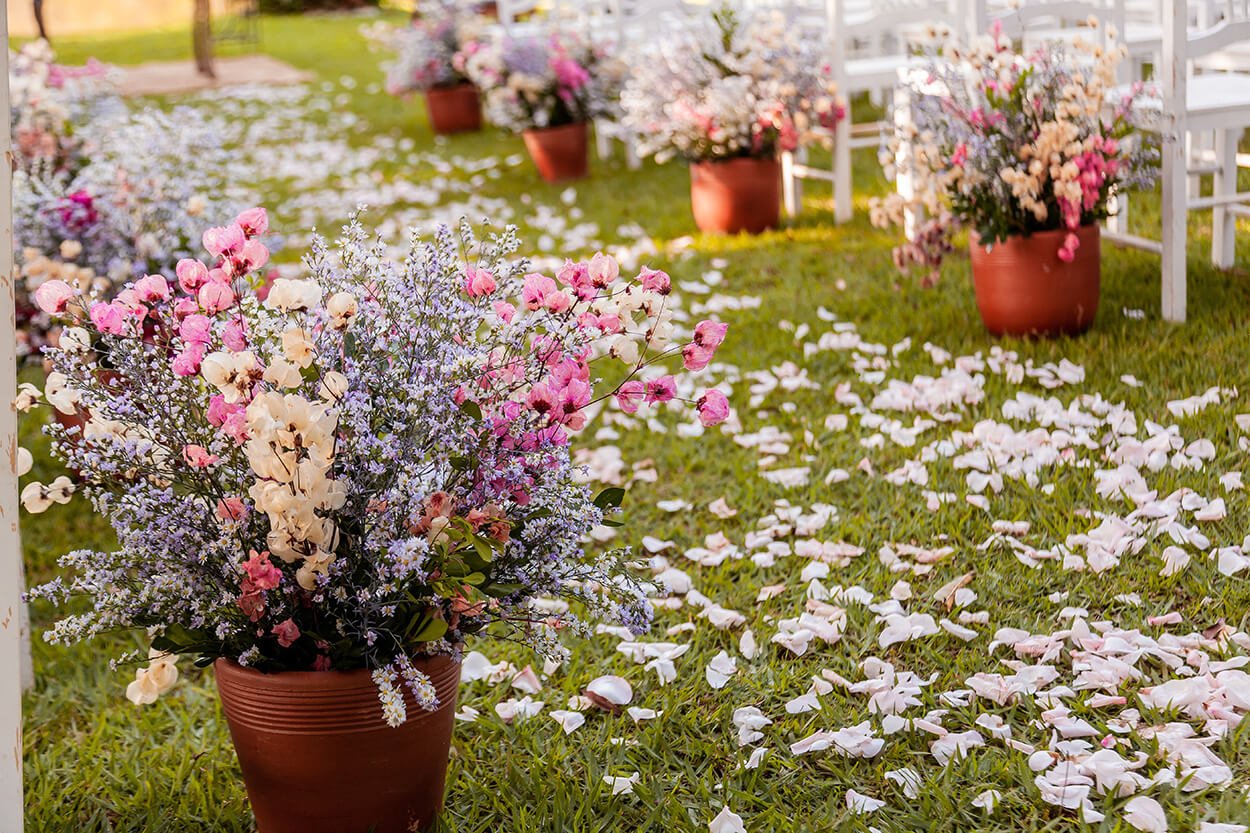 A melhor parte da decoração é esse clima de fim de semana tranquilo na chácara. Os arranjos florais foram as estrelas da decor, e nos conquistaram com essa mistura inesperada e refrescante com costela de adão. Para provar que nem todo casamento romântico é sinônimo de paleta cor de rosa, esse é um belo exemplo de ambientes românticos com muito lilás.