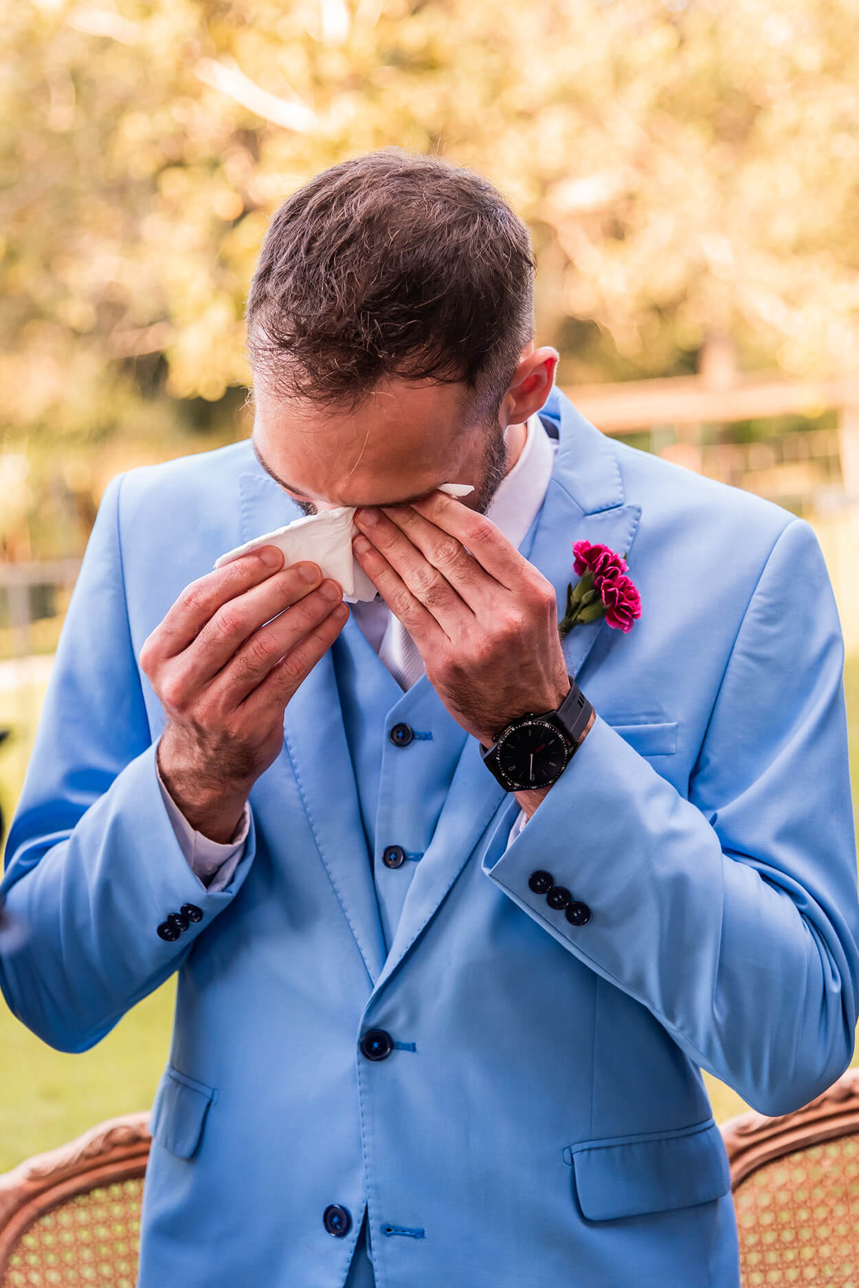 Com o noivo, não poderia ter sido muito diferente. Por isso, ele investiu em um terno considerado mais formal, o traje completo com três peças (calça, paletó e colete). Mesmo assim, a produção ficou mais moderna e descontraída com esse lindo tom de azul.
