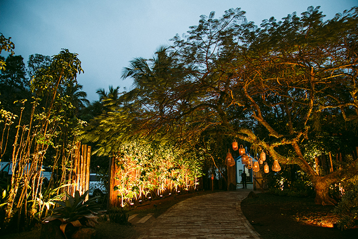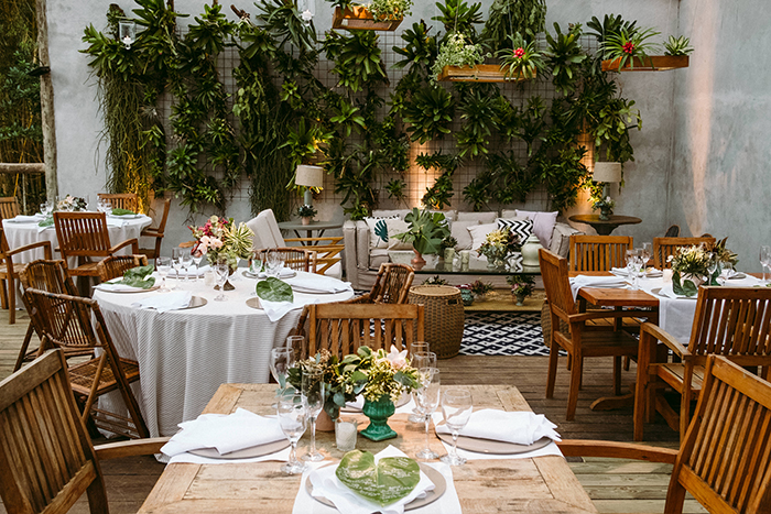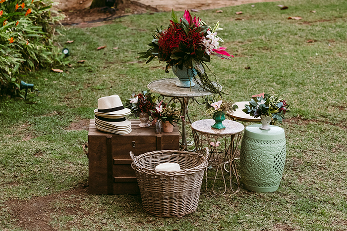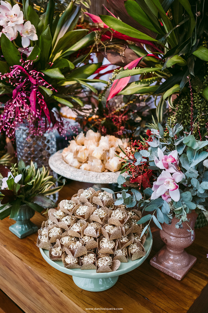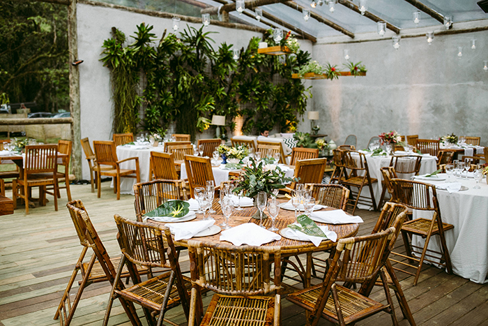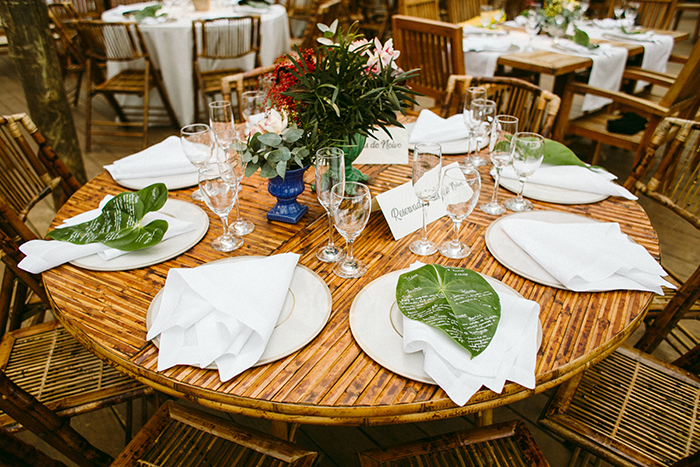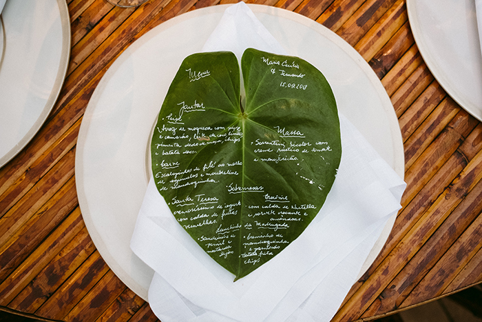 Os cardápios em folhas de antúrio que trouxeram uma vibe bem tropical a decoração, foram escritas à mão, um a um, pela mãe da Maria Cecília, que é artista plástica.