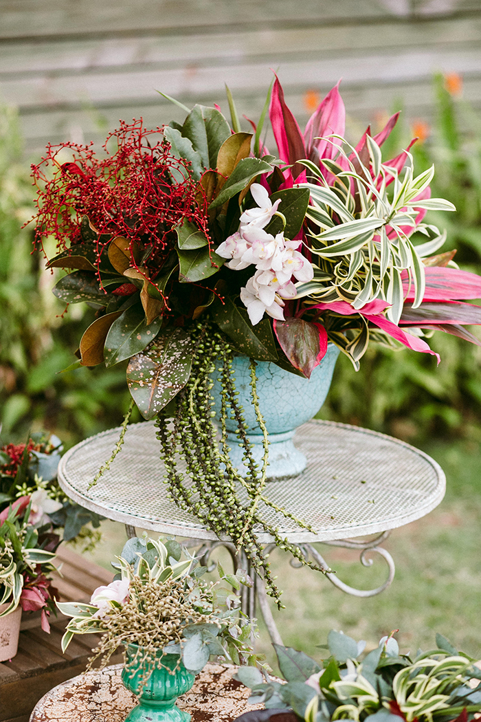 Além disso, na decoração – que foi feita, assim como as flores, acessório de cabelo da noiva e lapelas, pela Glau Miranda – não poderia faltar a guirlanda de flores atrás deles no momento da cerimônia. A Glau procurou seguir com muito verde, em diferentes tons e cores mais neutras como Fendi, para a decoração. Para os arranjos florais, escolheram o marsala para dar contraste.