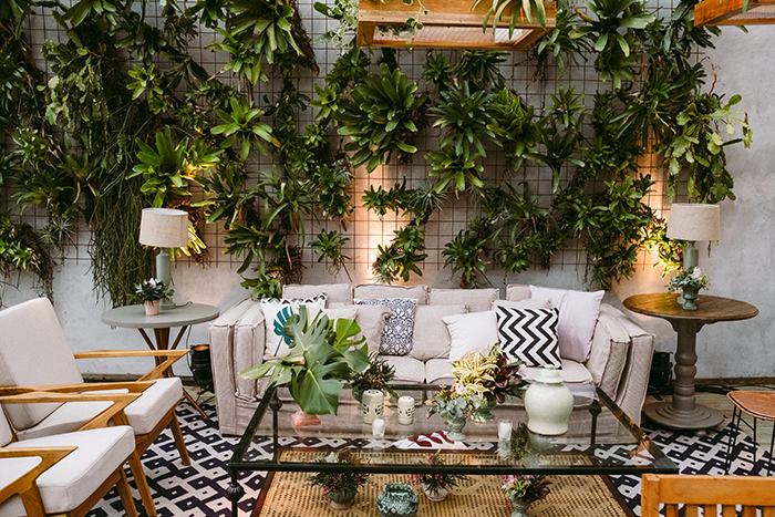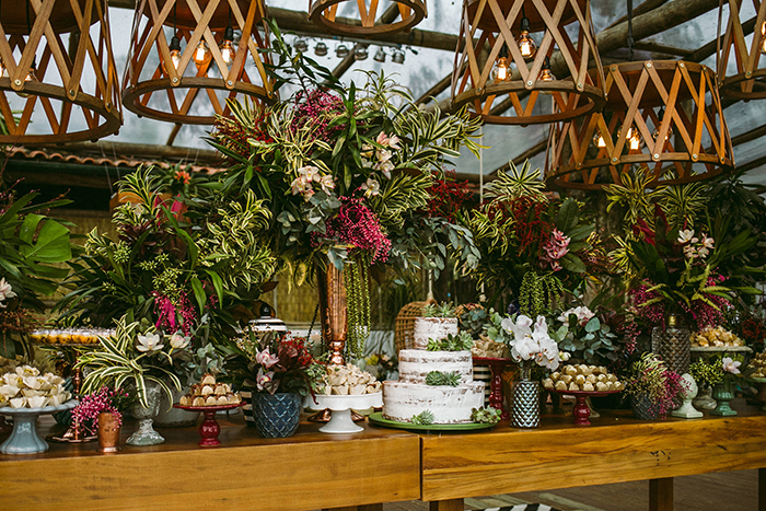 Além disso, na decoração – que foi feita, assim como as flores, acessório de cabelo da noiva e lapelas, pela Glau Miranda – não poderia faltar a guirlanda de flores atrás deles no momento da cerimônia. A Glau procurou seguir com muito verde, em diferentes tons e cores mais neutras como Fendi, para a decoração. Para os arranjos florais, escolheram o marsala para dar contraste.