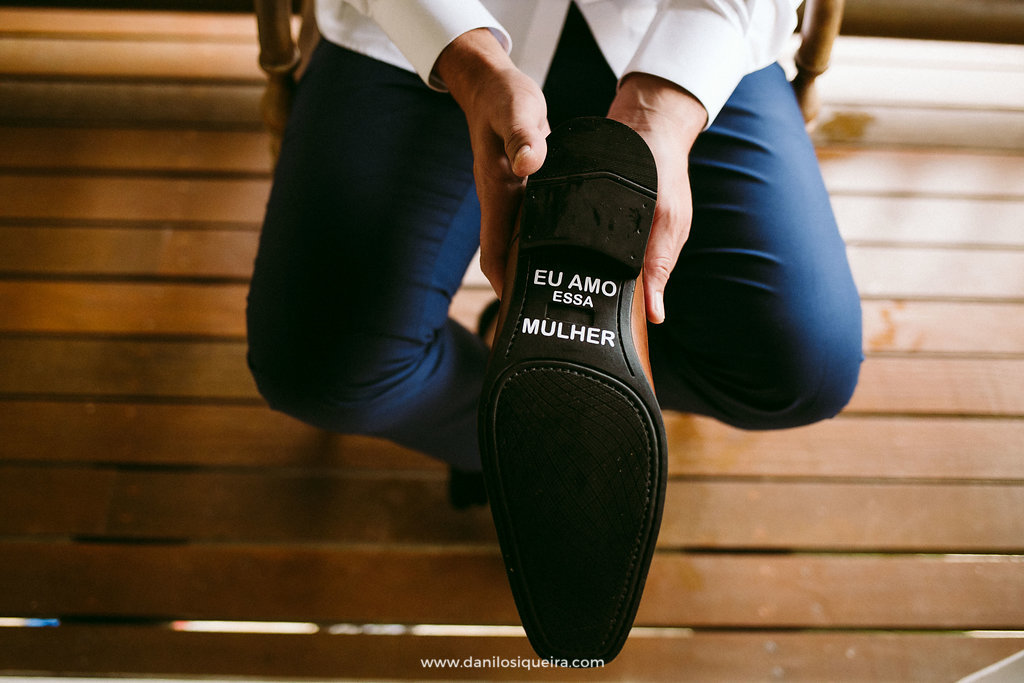 A mãe da Maria Cecília deu um toque pra lá de especial nas mesas, vocês vão ver nas imagens. Amamos também a mensagem no sapato do noivo!
