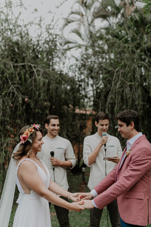 “Montamos uma cerimônia baseada nos quatro elementos da natureza, onde cada pessoa (pais e padrinhos tinham um elemento que destinamos à eles depois de pesquisarmos as características de cada um). Após abençoarmos esses elementos, houve um momento em que os celebrantes fizeram uma meditação guiada, bem rápida, mas muito significante.”