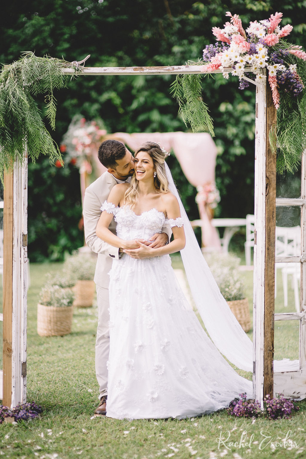 O SIM aconteceu em Pendotiba, Niterói. Como o casamento era de dia, a Bruna quis se sentir em um jardim. Escolheu cores claras para as flores, como o rosa chá e variações de rosa, branco e verde. Foi como casar em um jardim rústico encantado!