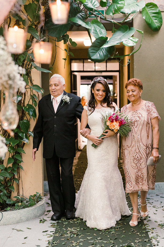 Foi a entrada da Elizete com seus pais juntos. “Meu pai estava doente mas se recuperou e a entrada até o altar era a resposta às minhas orações. Ter a minha mãe junto na entrada me fez sentir segura e muito grata. Eles são minha base e decidi fazer a homenagem a eles.”