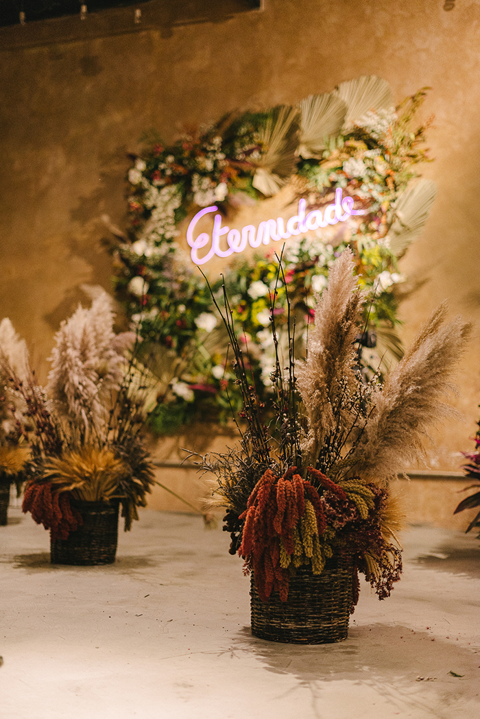 Desde o princípio sonhavam com um estilo boho chic, mas que tivesse um toque contemporâneo. “Diz muito sobre nossa personalidade romântica e moderna ao mesmo tempo.” Quando entraram na proposta de uma primeira cerimônia, decidiram manter o estilo boho chic, porém não escolheram nada para essa cerimônia diferente do que planejaram para a festa que precisaram adiar. “Deixamos tudo nas mãos do nosso decorador, que fez muito mais do que sonhávamos.”