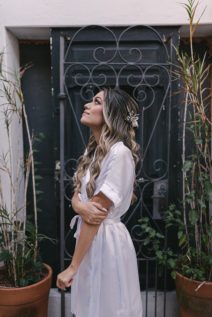 Quando se viram obrigados a adiar a festa para 200 convidados, eles não abriram mão do dia da cerimônia. Cerca de dez dias antes do que seria só uma cerimônia civil com troca de votos, o cinegrafista Rodrigo de Paula fez uma proposta que parecia meio maluca, mas que fez todo sentido para os noivos. Ele sugeriu uma transmissão ao vivo, um novo modelo de casamento para quem não desistiu de sonhar durante o isolamento social. “Mas como ele não brinca em serviço, o projeto audiovisual ficou muito maior e melhor do que esperávamos. Nunca imaginamos casar dentro de um filme hollywoodiano!”