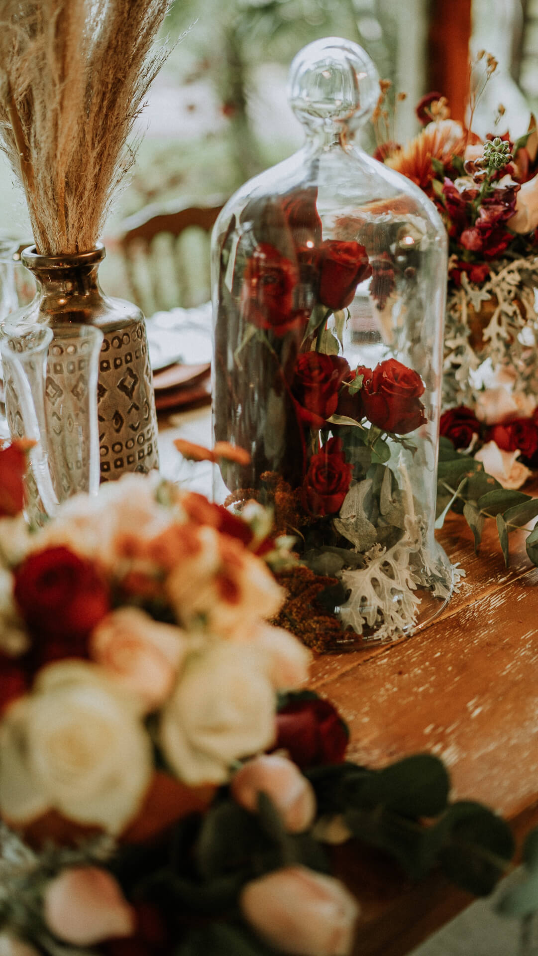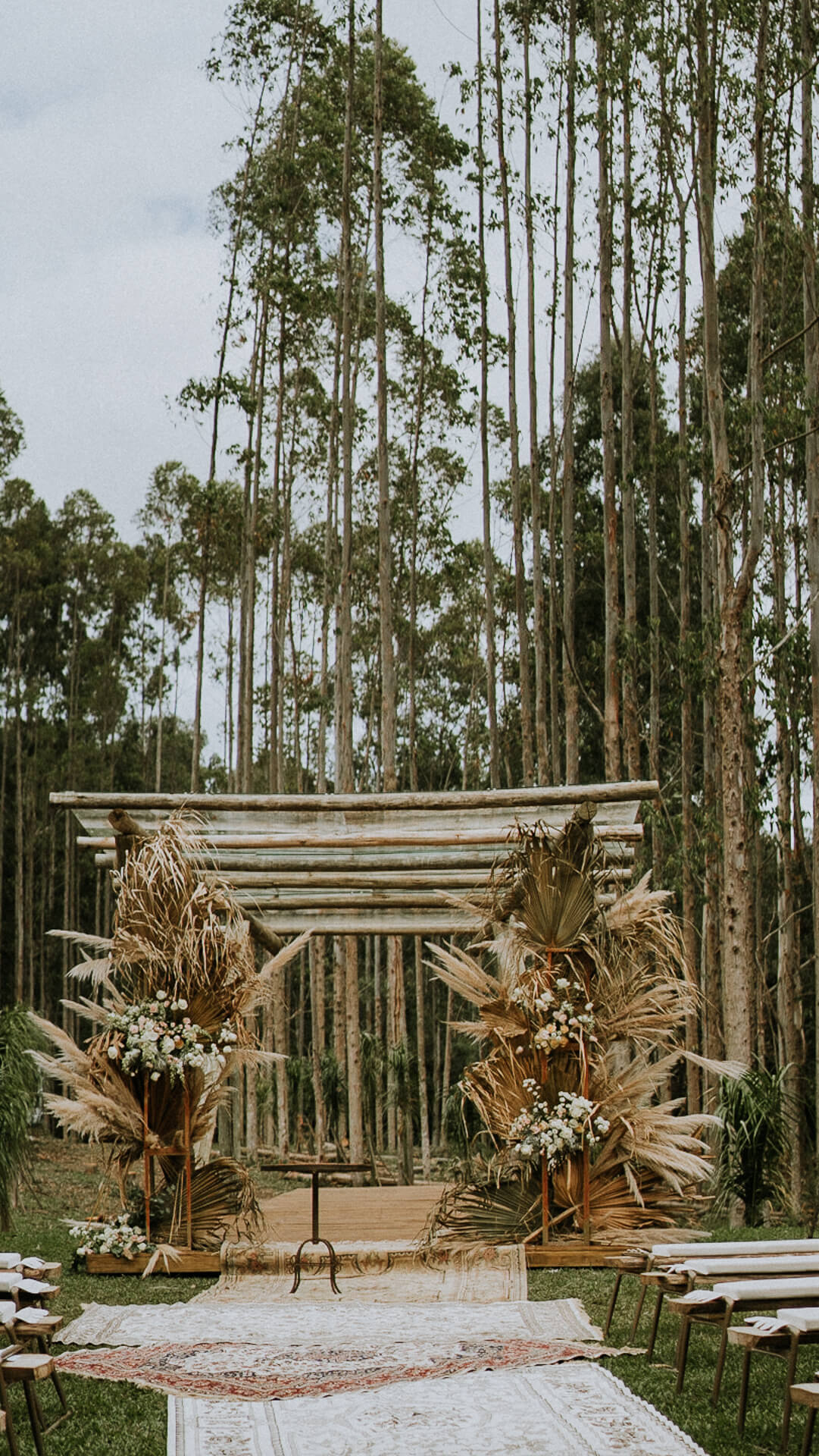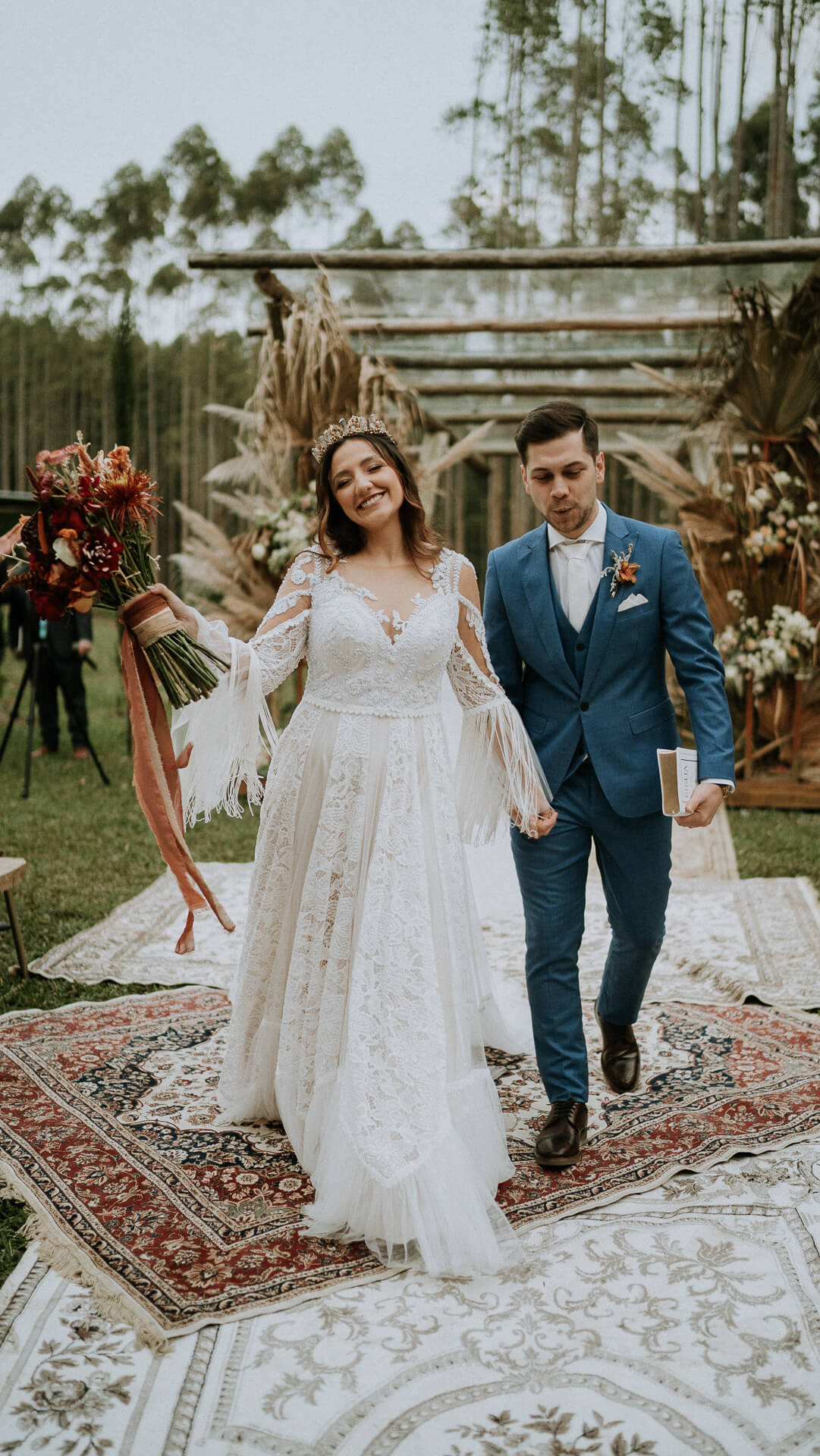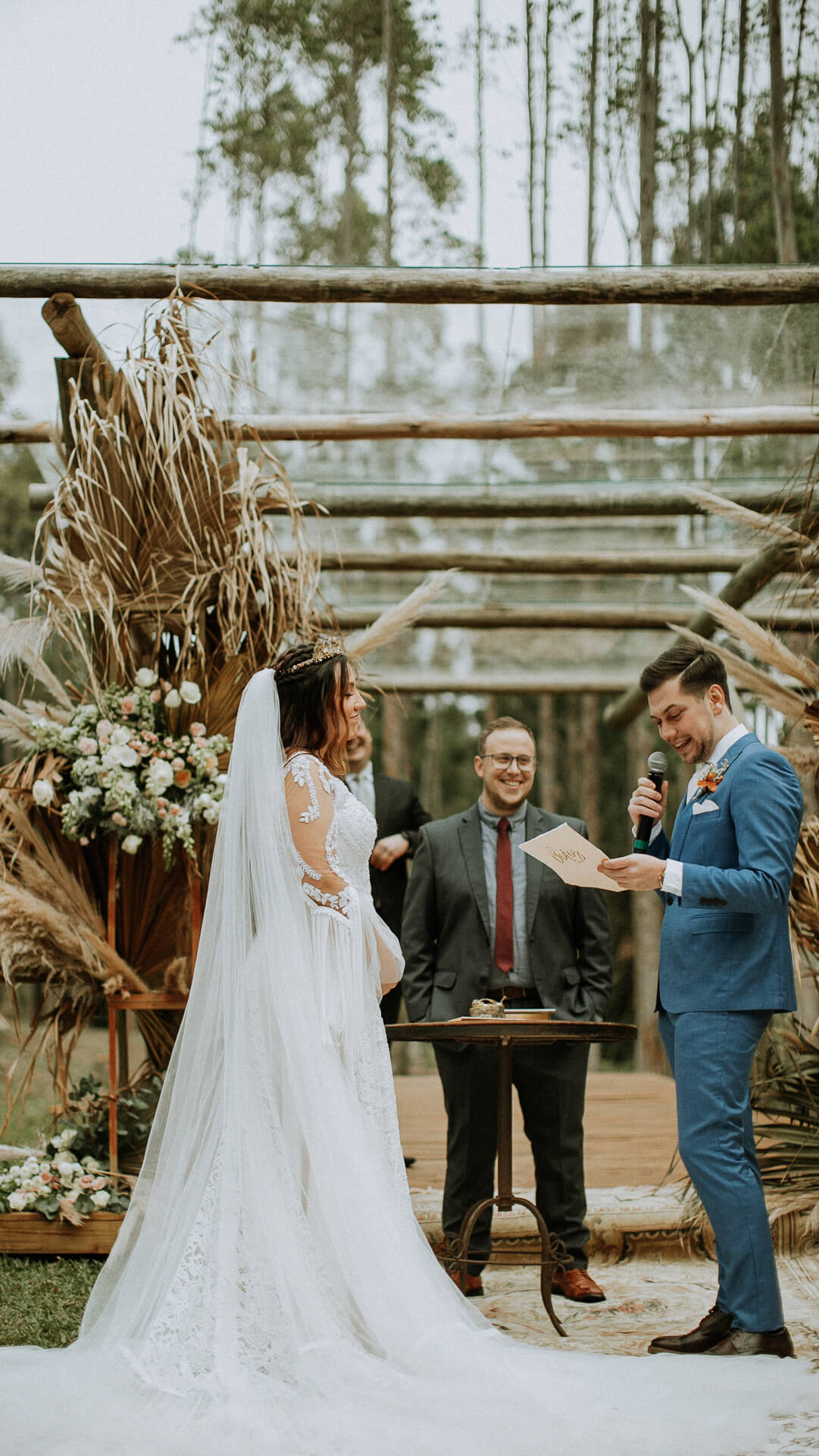 O SIM da Bárbara e do José aconteceu numa linda tarde, ao ar livre, no Paraná. A decoração seguiu o estilo boho chic com muitos arranjos com folhagens secas, tudo em perfeita harmonia com o mix de flores mais escuras, já que a noiva não queria nada muito colorido.