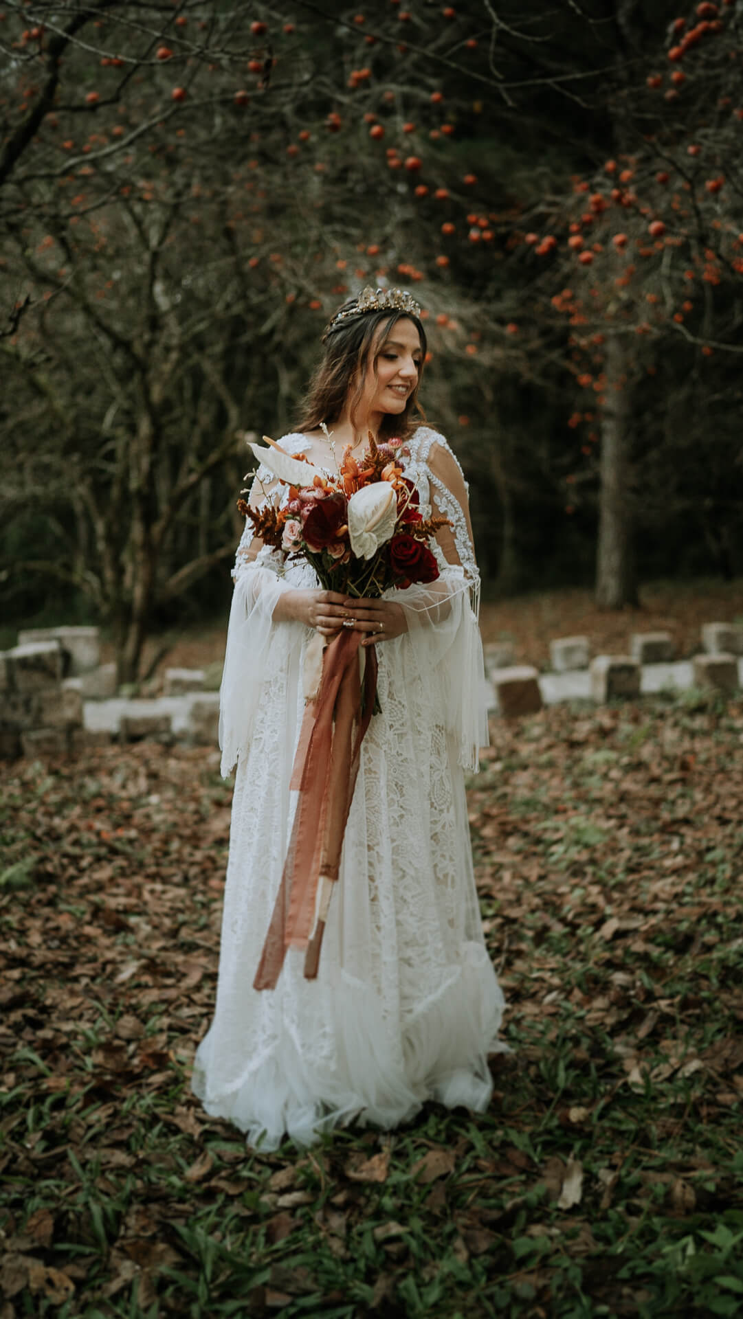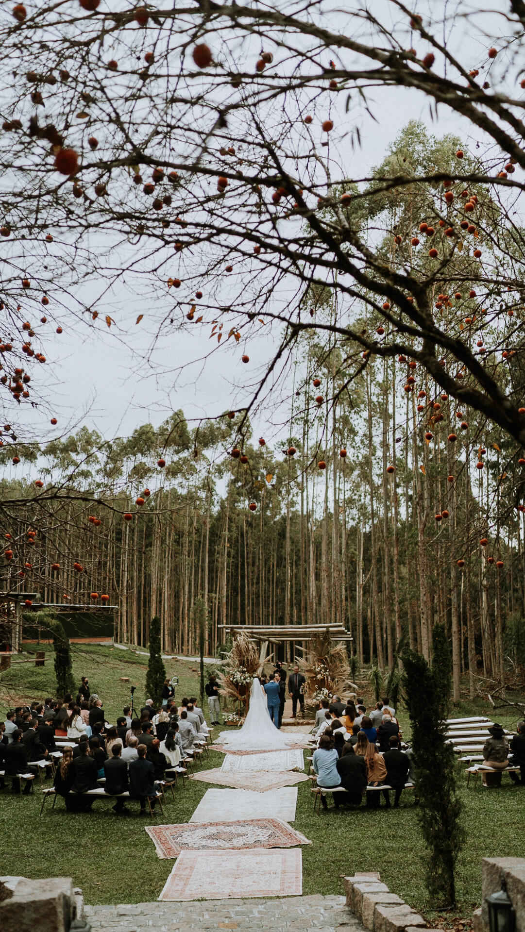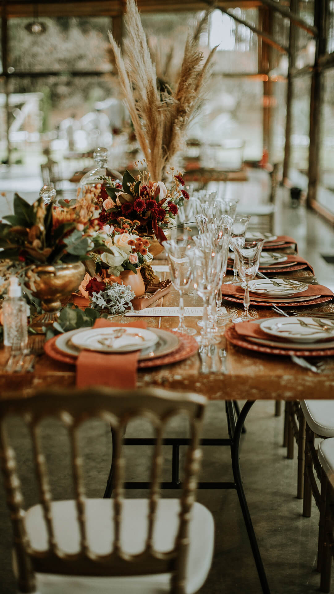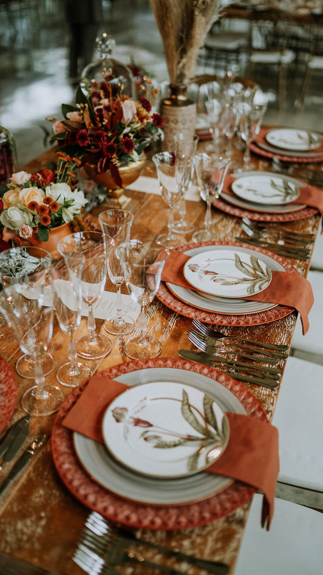 O SIM da Bárbara e do José aconteceu numa linda tarde, ao ar livre, no Paraná. A decoração seguiu o estilo boho chic com muitos arranjos com folhagens secas, tudo em perfeita harmonia com o mix de flores mais escuras, já que a noiva não queria nada muito colorido.