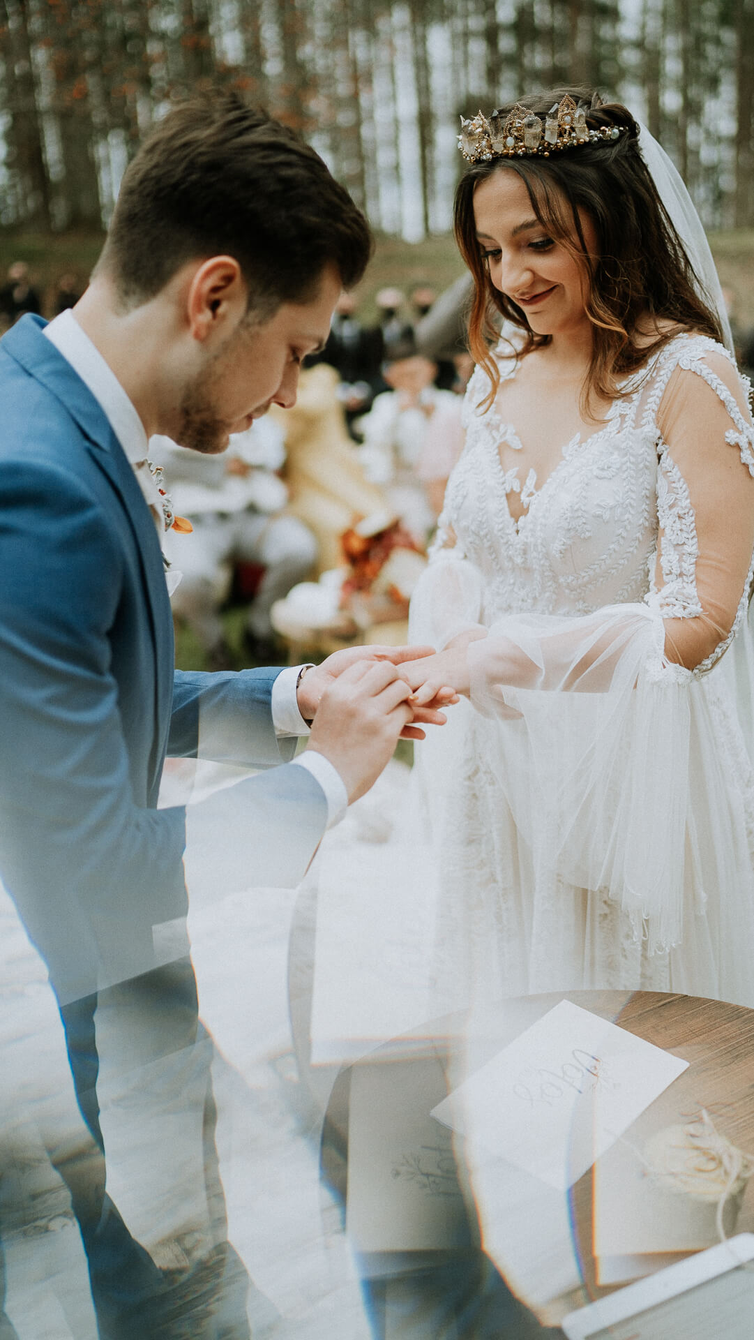 “Eu não sabia de nada, fui para casa, eles me vendaram e tive que fazer como se fosse um caça tesouro, para chegar no pedido de casamento oficial. Quando eu consegui completar o caça tesouro, eles tiraram minha venda, e o José estava ajoelhado em minha frente com a aliança na mão”.