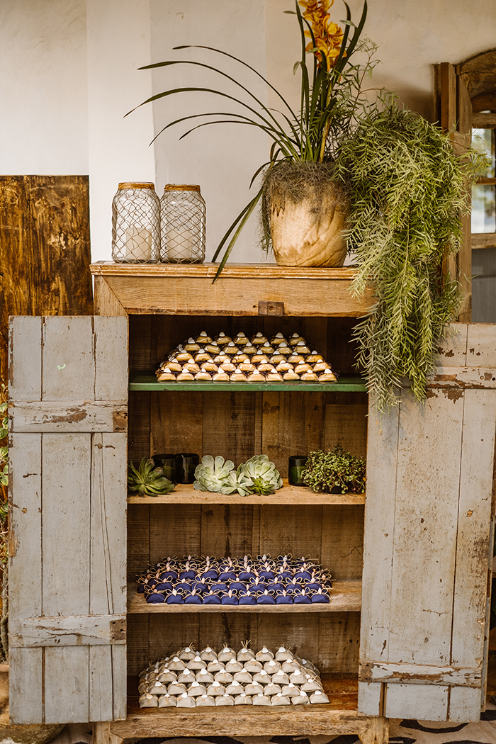 Como o casamento foi no outubro, a decoração seguiu uma paleta de cores tons mais invernais: verde mais acinzentado, azul marinho, terracota e vinho.