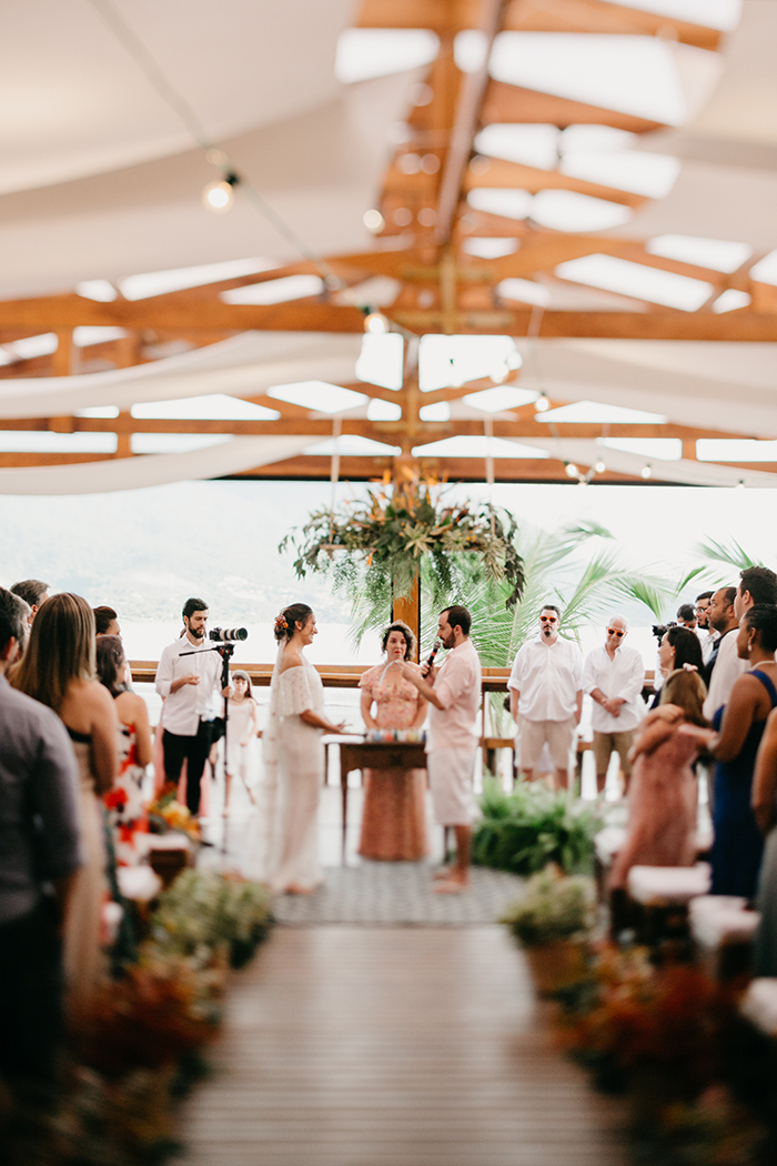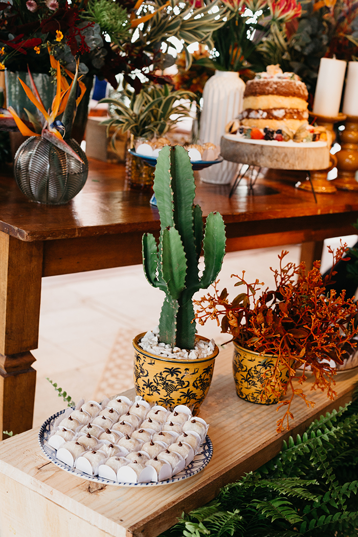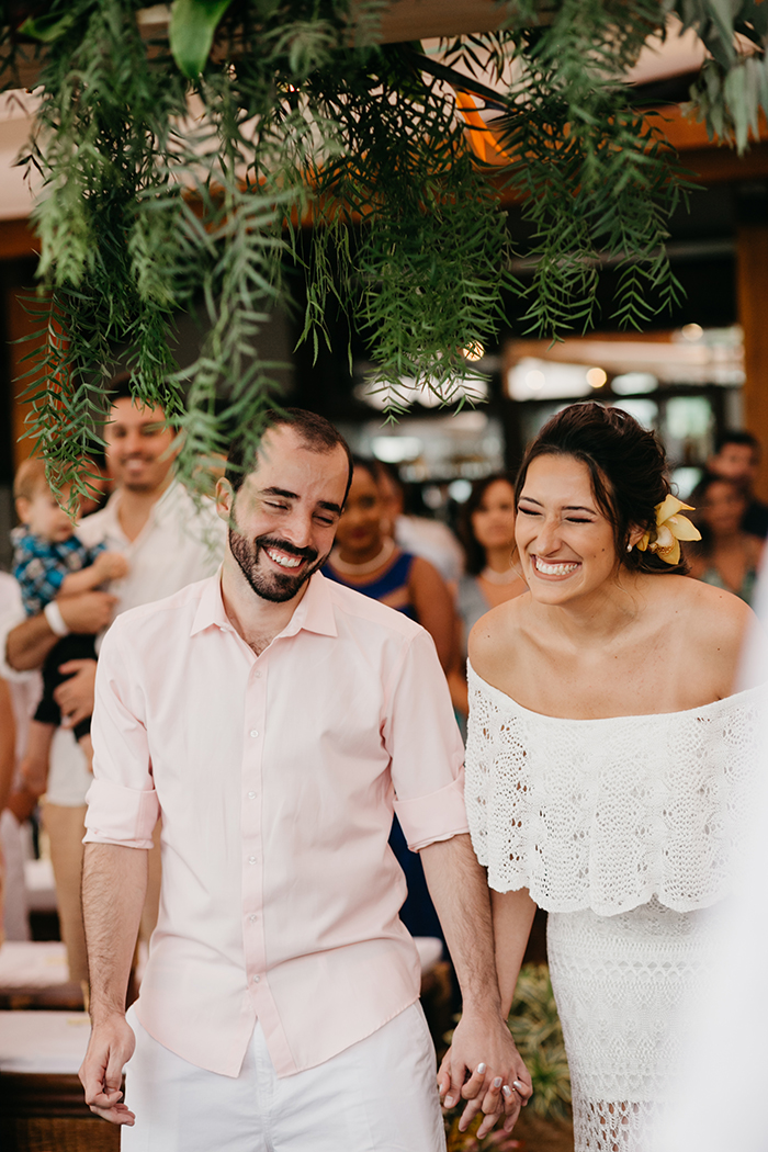 O casamento seguiu o estilo tropical/baiano. “Nos sentimos baianos de coração. Aproveitamos que o casamento seria pé na areia e pedimos para os padrinhos e convidados para irem com roupas confortáveis, leves e soltas, rasteirinhas, chinelos, etc. Buscamos referências que lembrassem cores quentes e itens que remetessem à Bahia.”