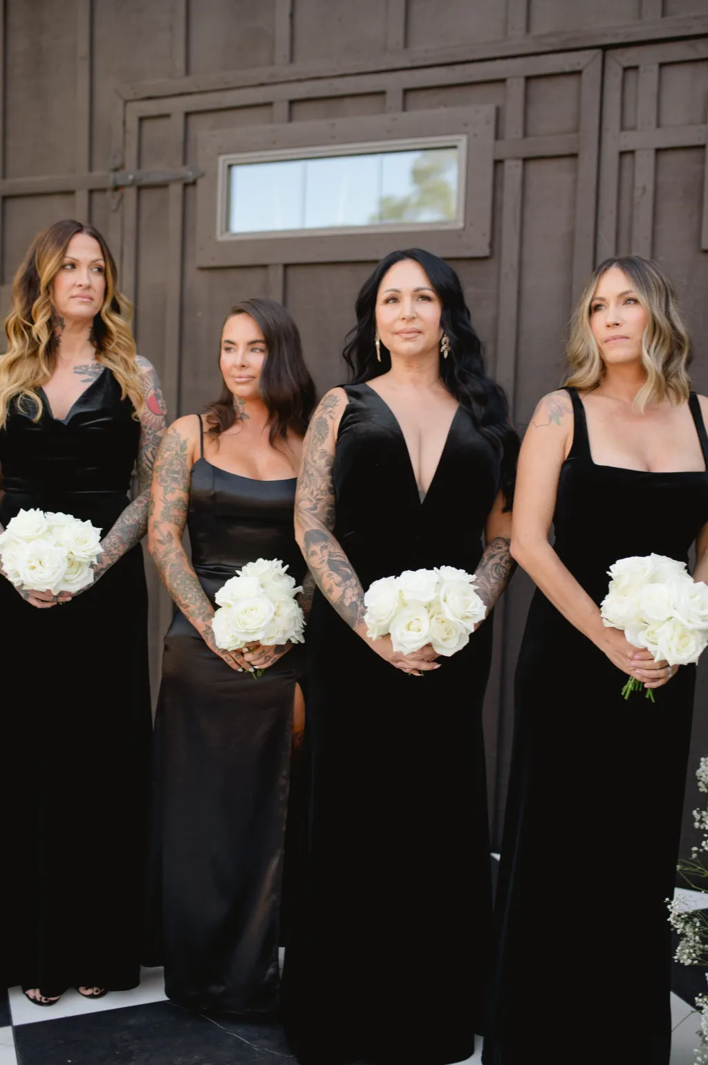 Para as madrinhas, os vestidos pretos são uma escolha certeira, permitindo que a noiva se destaque no branco enquanto todas mantêm a harmonia da paleta.