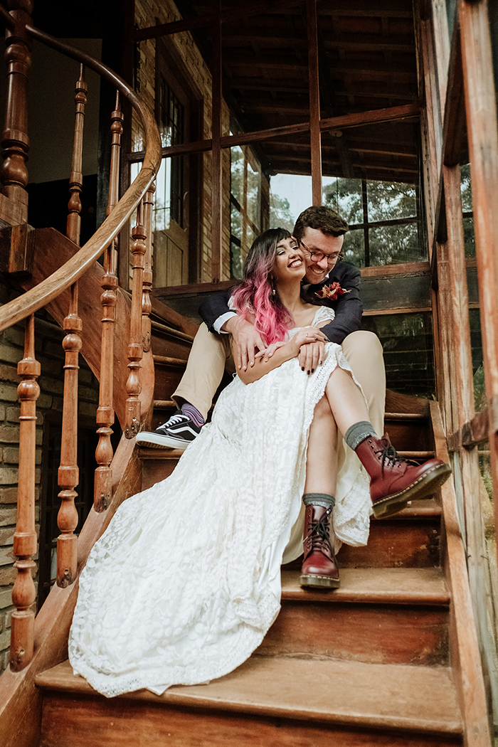 A princípio a Ana Paula e o Leonardo não se identificavam com nenhum estilo, por isso quando decidiram fazer uma cerimônia uniram o gosto musical e estilo de se vestir, resultando em um casamento black ou “trevoso” como gostam de brincar. Tiveram neon rock’n roll, rosas negras, banda de rock, noiva de coturno, noivo de vans e paletó xadrez e uma pitada de loucura.