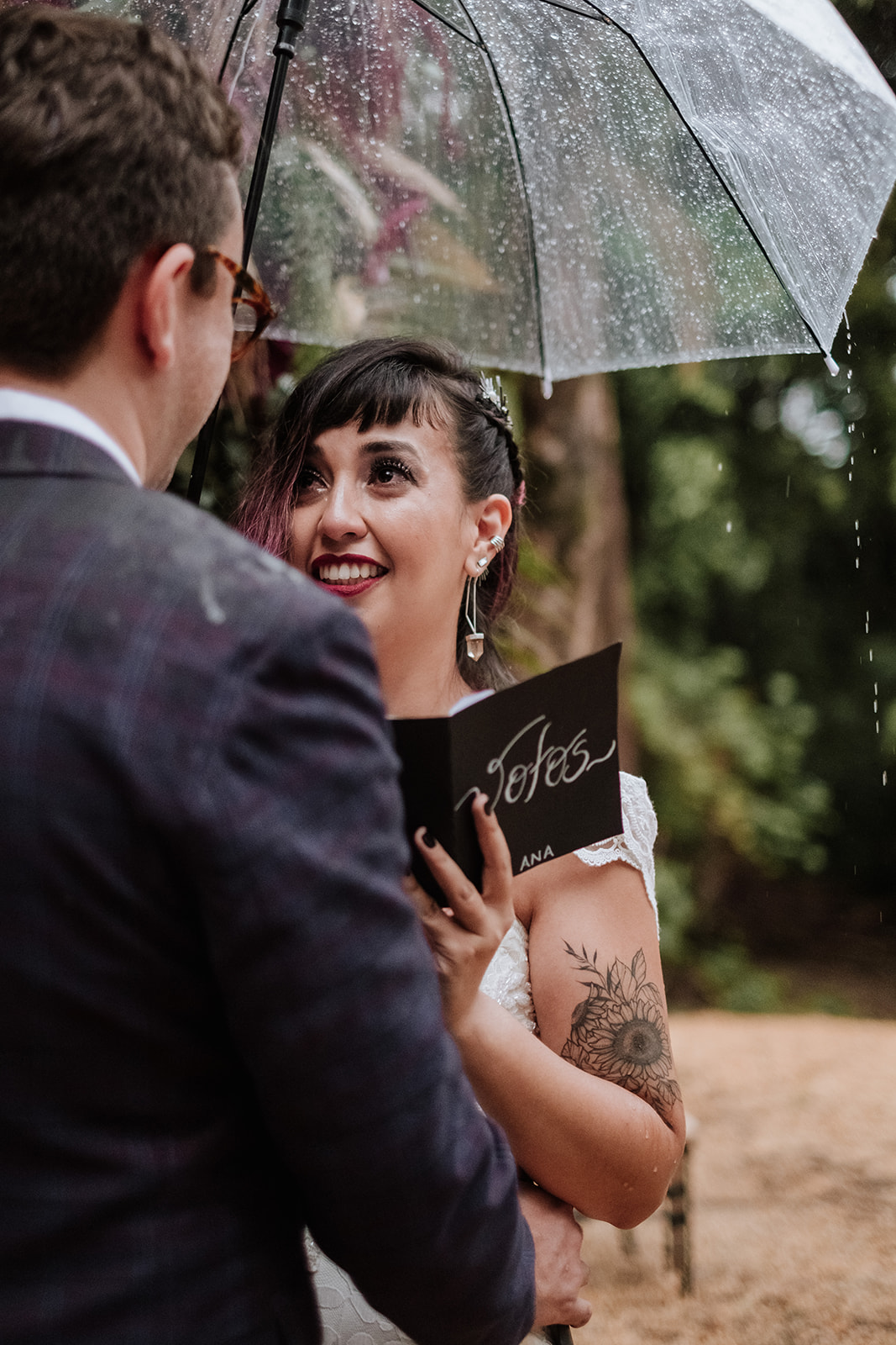 “Foi quando os fotógrafos conversavam comigo sobre o meu sonho em casar na clareira, que eles sugeriram de fazer uma cerimônia apenas comigo e o Léo na chuva mesmo. Na hora eu e o Léo topamos, pois iriamos ter a nossa cerimônia única e especial como aquele lugar era para nós.”