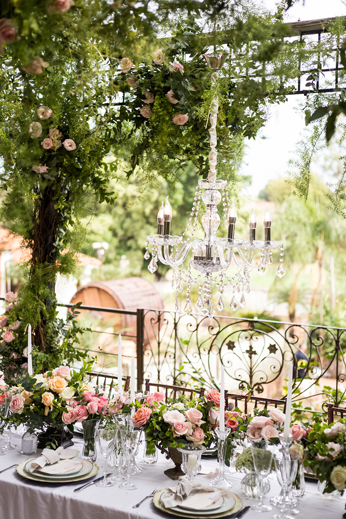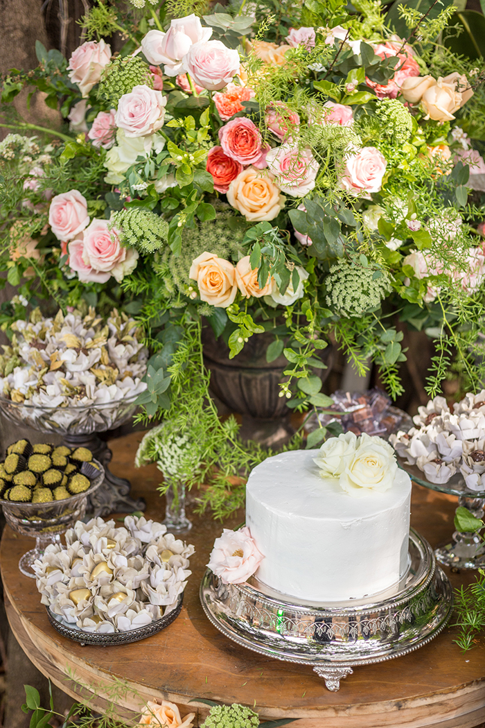 Junto com a decoração romântica e delicada com muitas rosas, em tons de nude valorizado pelo verde como cor de fundo, o espaço ficou perfeito para esse dia único.