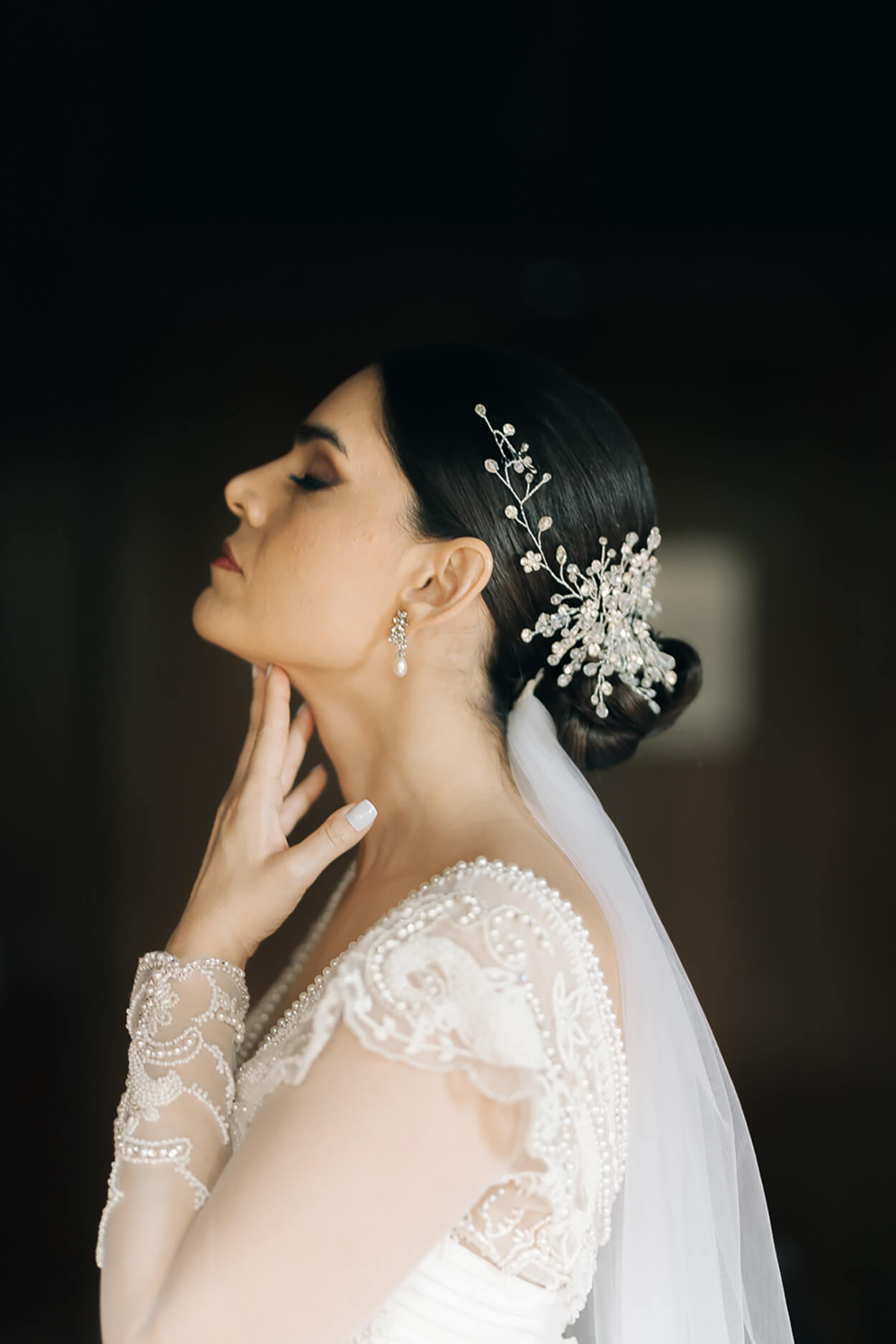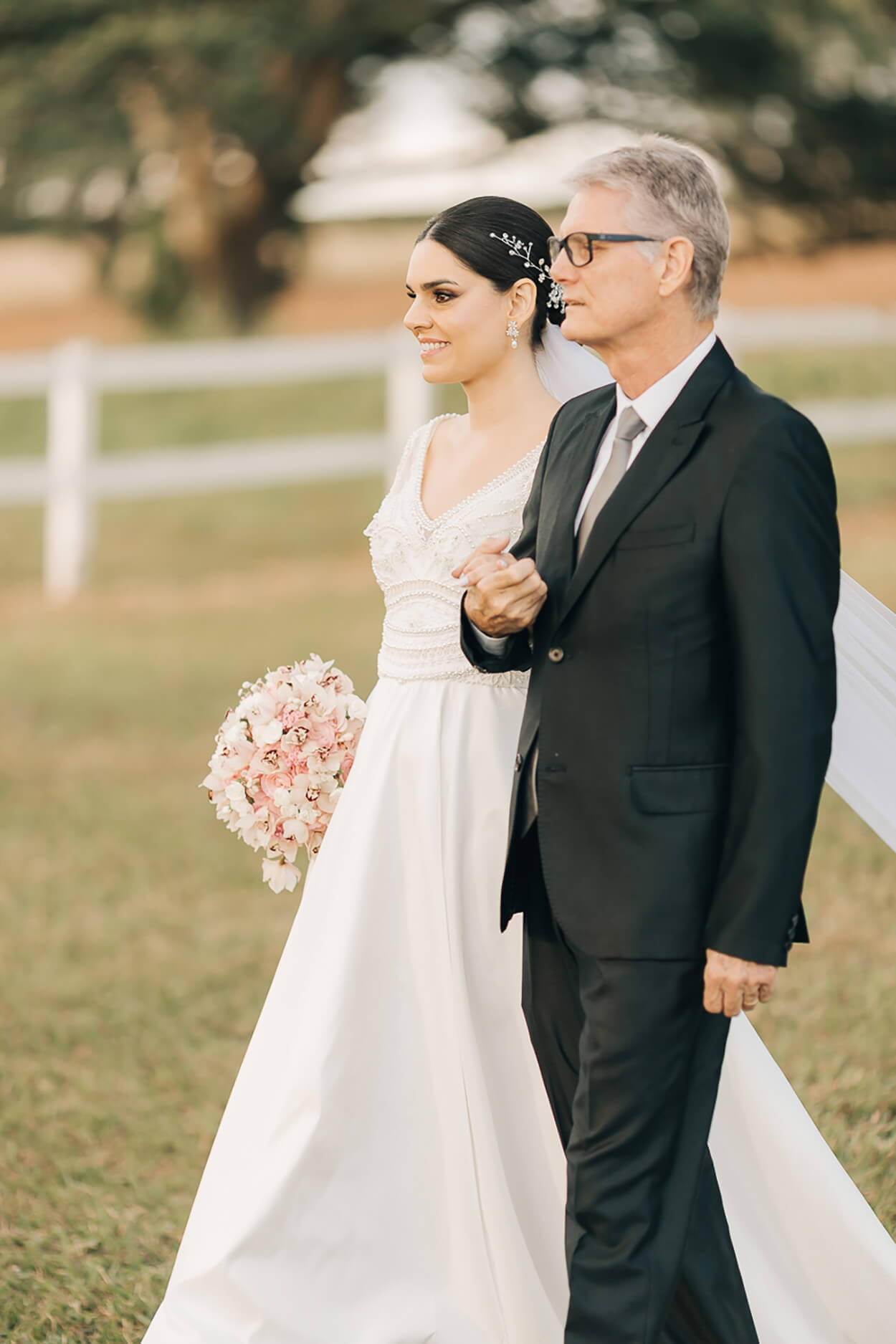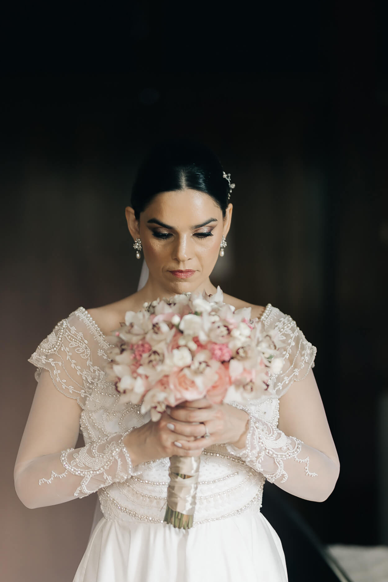 Ficamos apaixonadas pela riqueza de detalhes desse vestido! Esse mix de transparência, bordados e aplicações de pérolas ganhou nossos corações. Para arrematar, Marília apostou em chignon baixo com acessório cheio de personalidade.