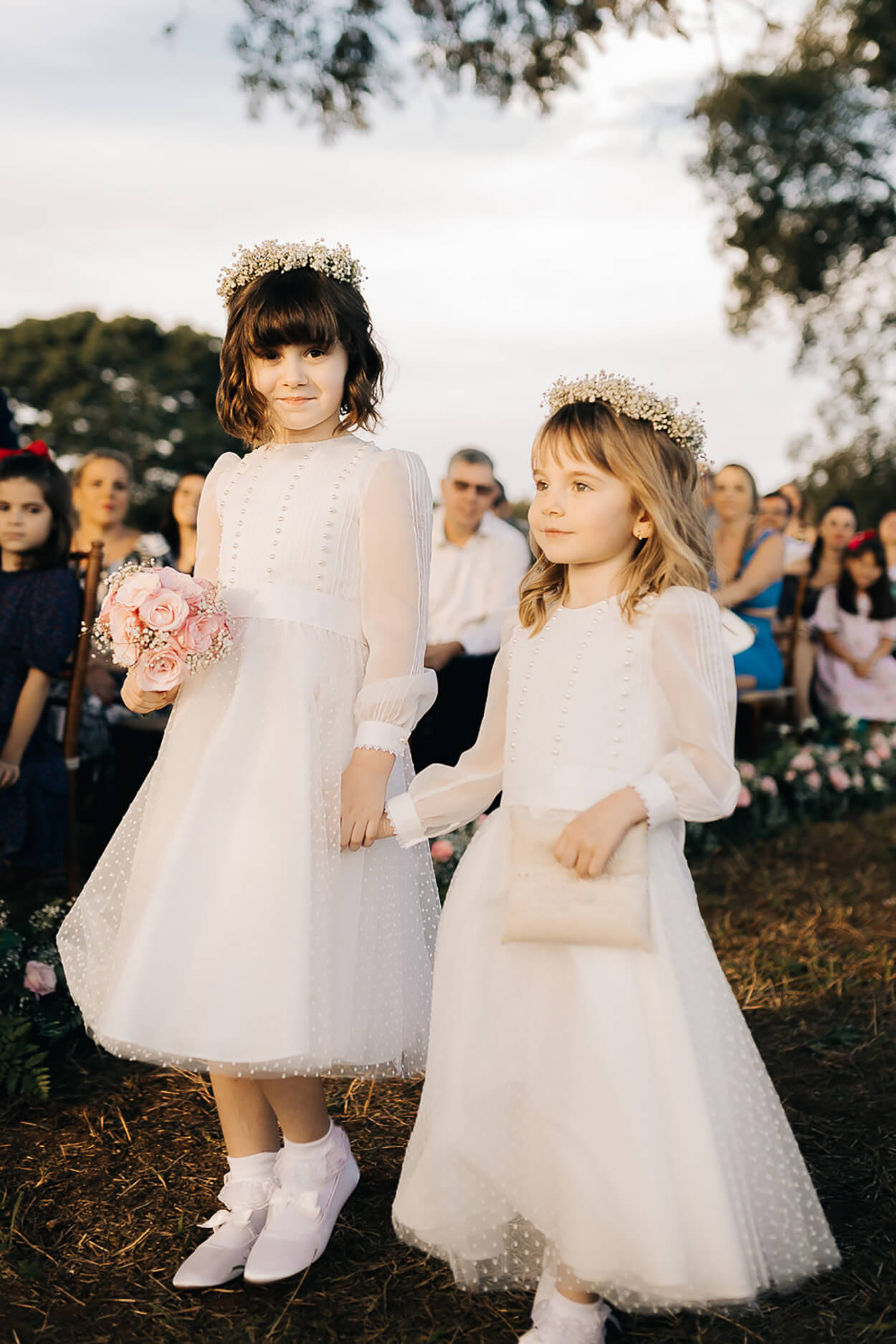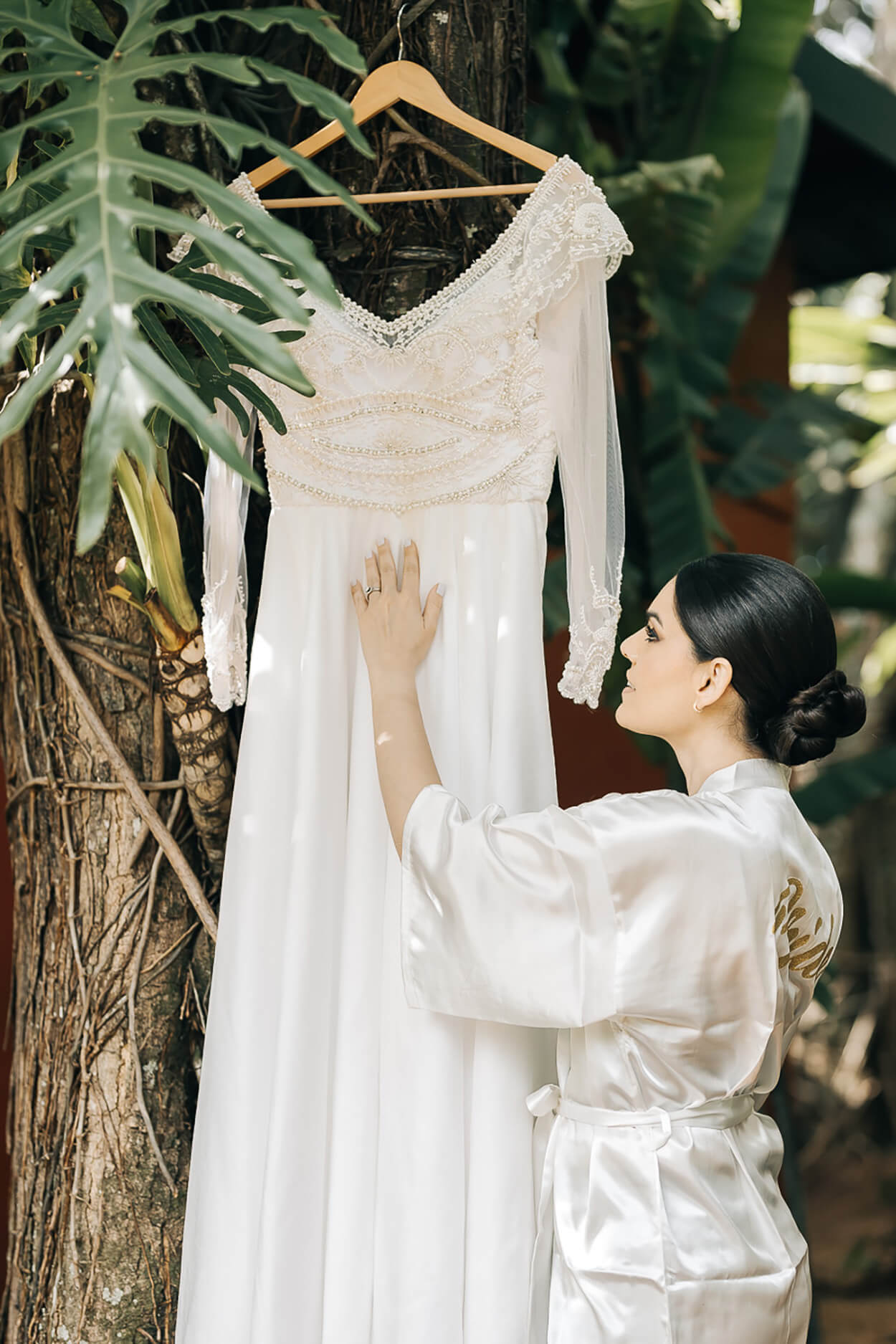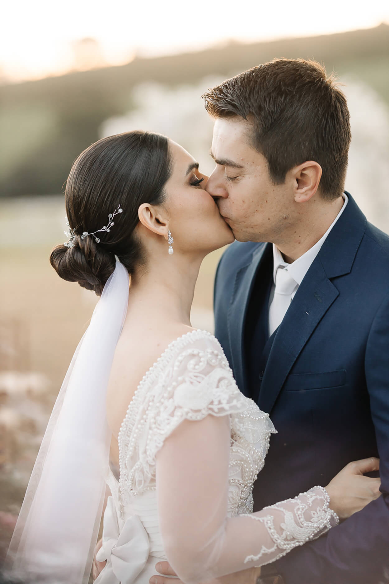 Ficamos apaixonadas pela riqueza de detalhes desse vestido! Esse mix de transparência, bordados e aplicações de pérolas ganhou nossos corações. Para arrematar, Marília apostou em chignon baixo com acessório cheio de personalidade.