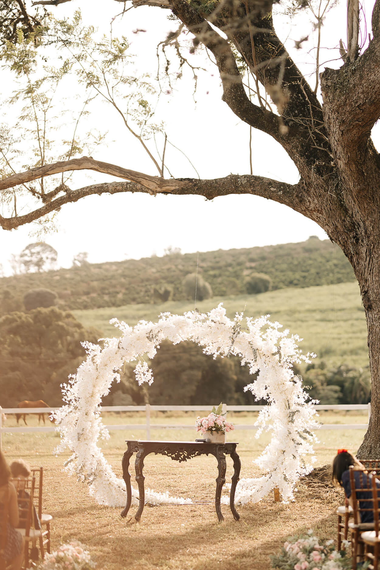No campo, a escolha do altar fica ainda mais importante. Ele será o elemento central na cerimônia e precisa ter o seu protagonismo e, ao mesmo tempo, combinar com a proposta natural.
