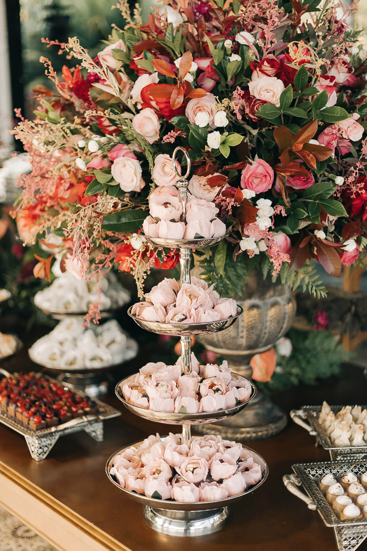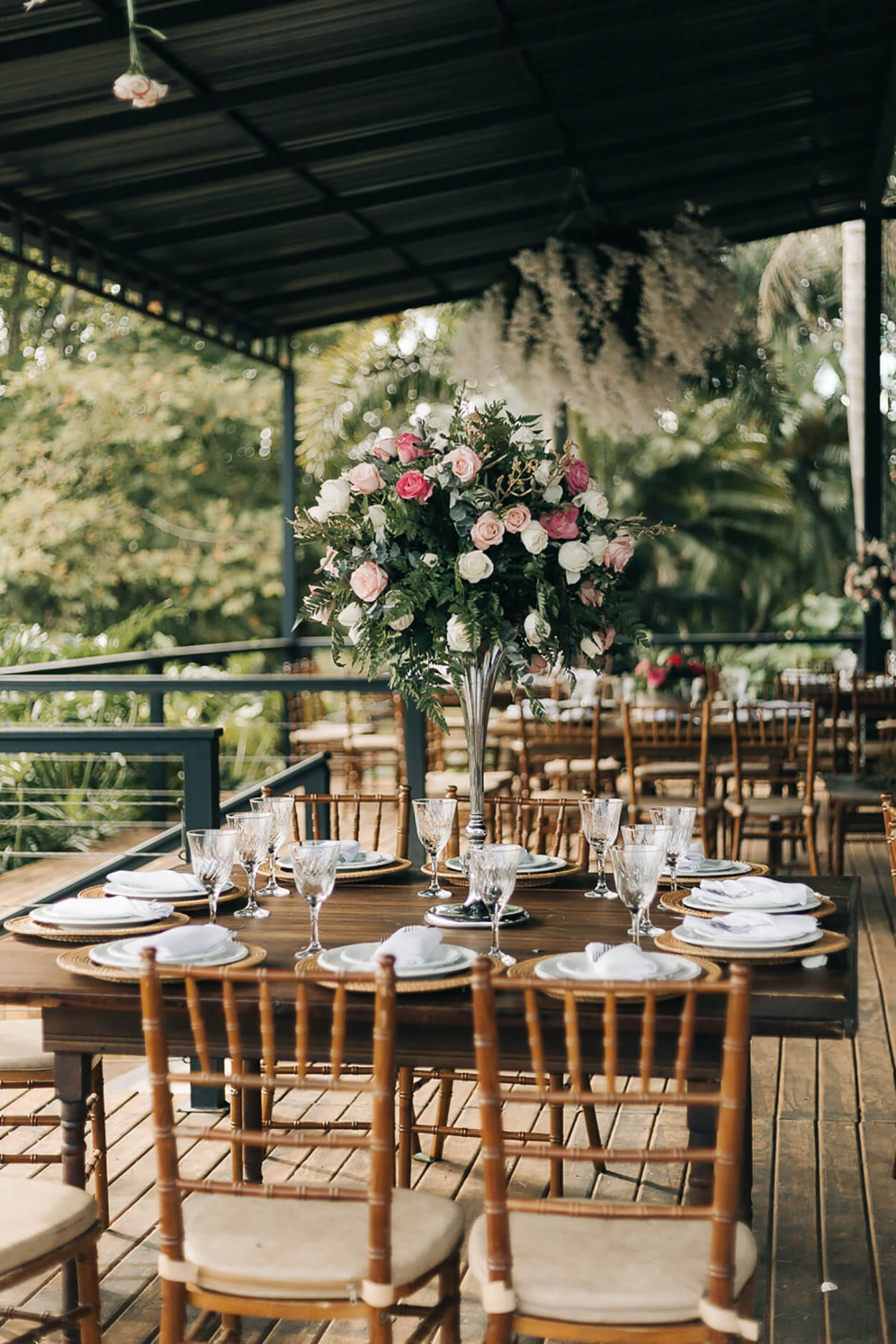A decor que trouxe tons de rosa traz a atmosfera romântica e delicada que o evento pede, enquanto o branco traz o equilíbrio e a paz.