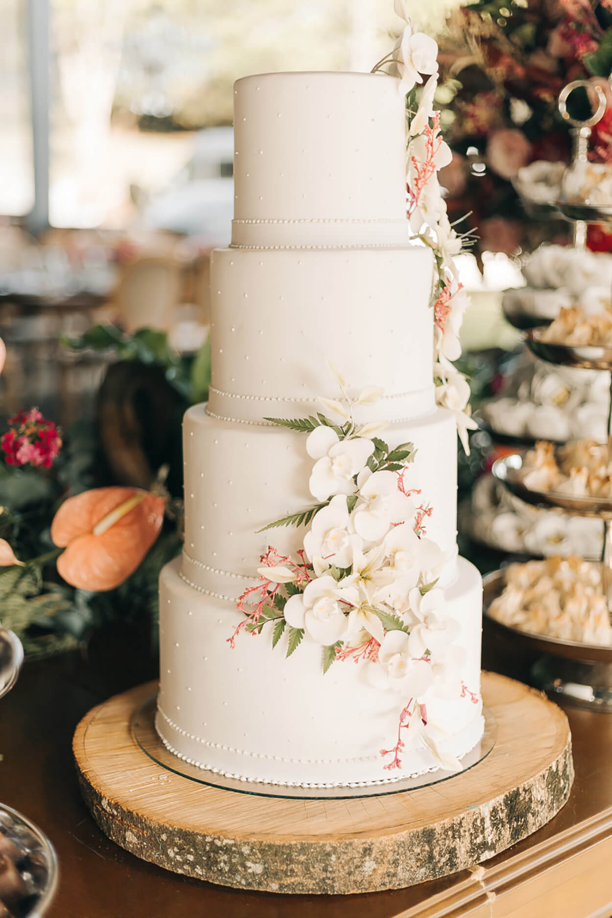 A composição das mesas postas e do bolo mesclam o aspecto mais natural da madeira com o toque elegante dos metais. E o que falar desse bolo? São quatro andares de puro charme!
