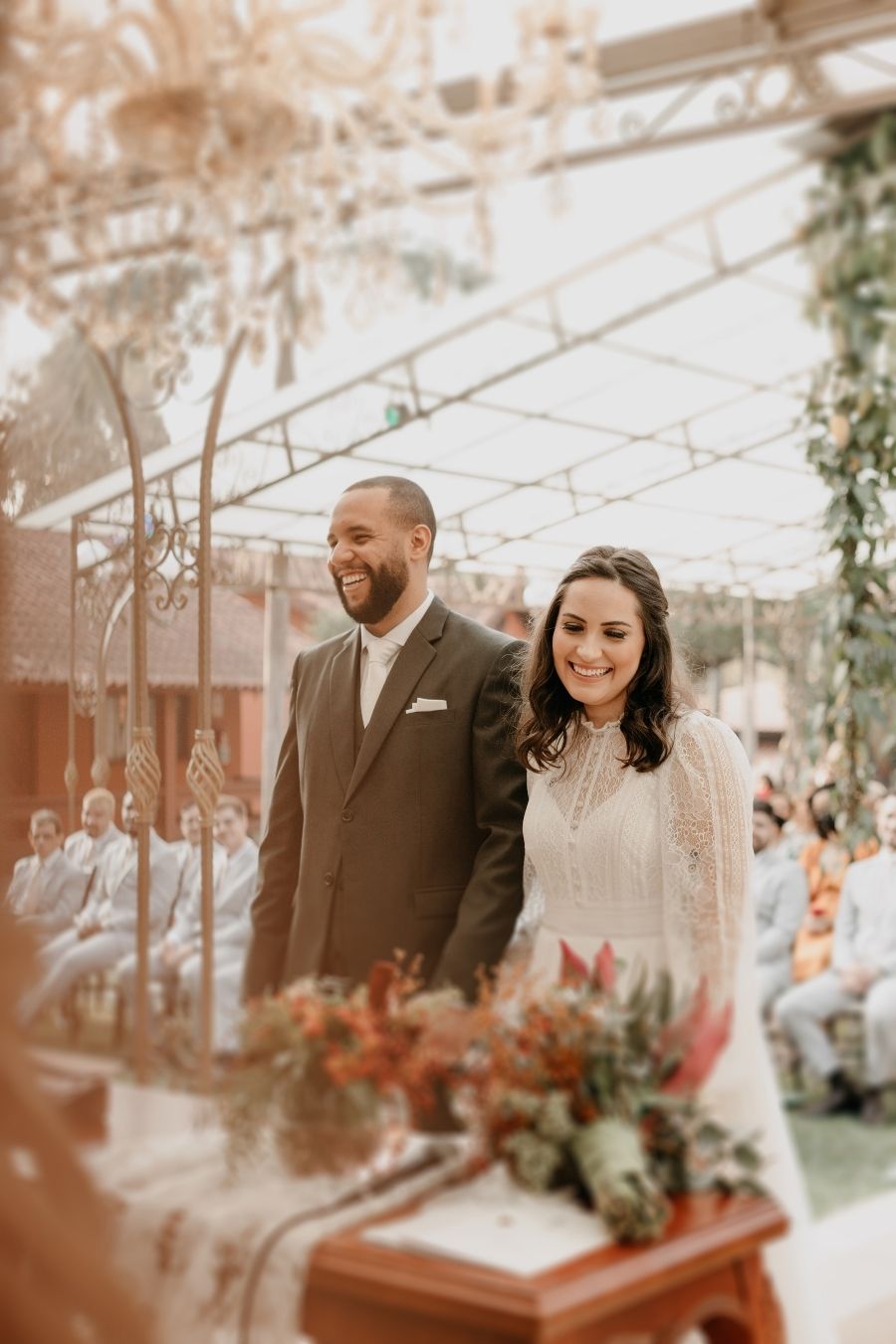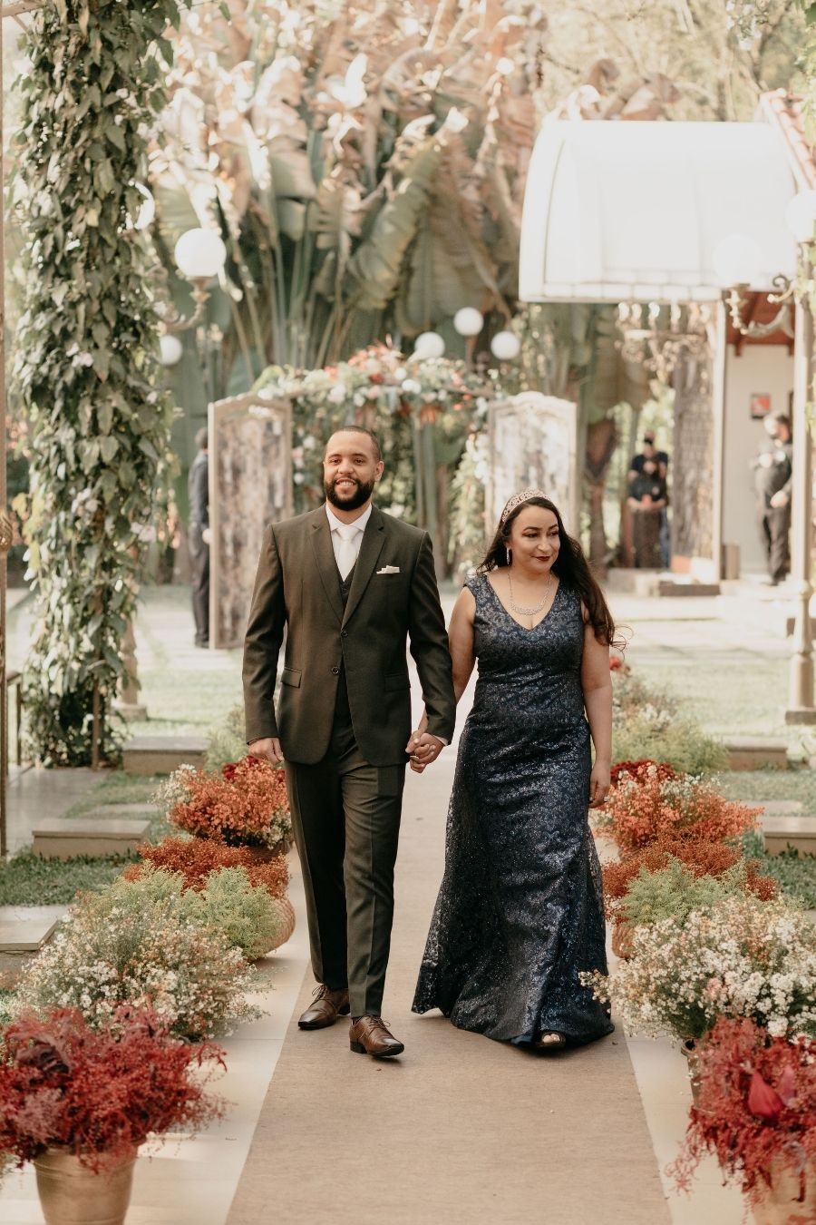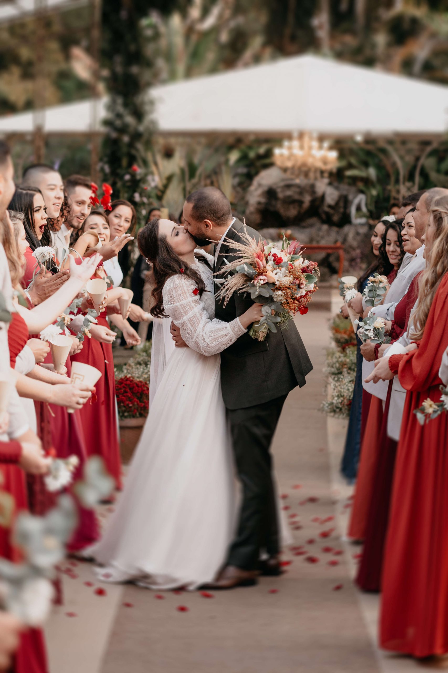 As cores marsala, terracota e cinza foram complementadas com muito verde e a felicidade não só do casal mas de todos os convidados.