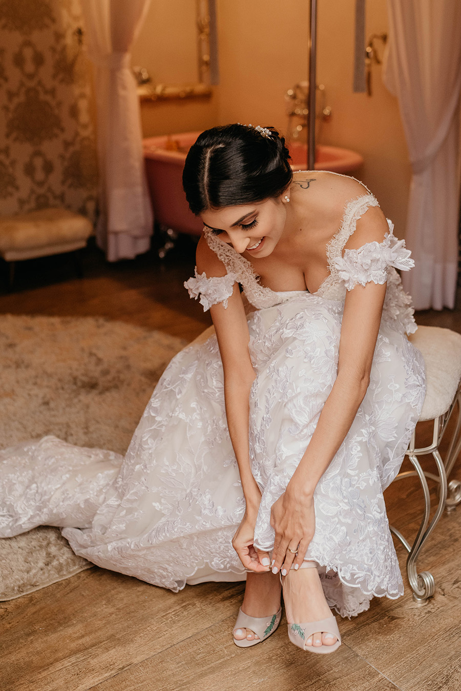 A sandália da Tássia foi inspirada na paleta do casamento dela: tons de azul serenity e rosa antigo. O modelo foi totalmente pintado à mão, até a cor de fundo, um nude que combinou com o seu tom de pele. Sendo assim, um truque importantíssimo para equilibrar o look noiva.