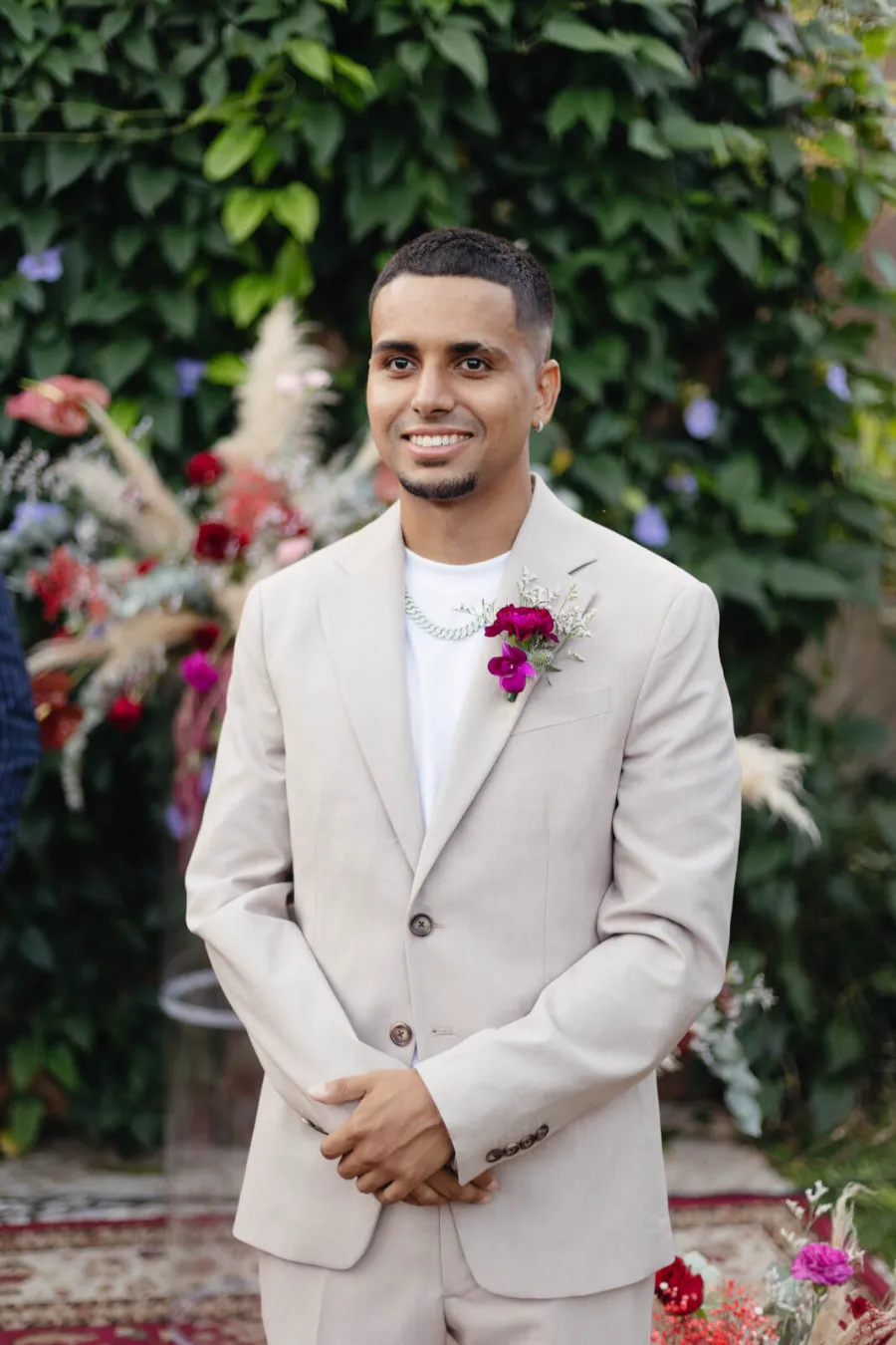 Com certeza! Um terno claro com gravata ou flor na lapela rosa é elegante e moderno.