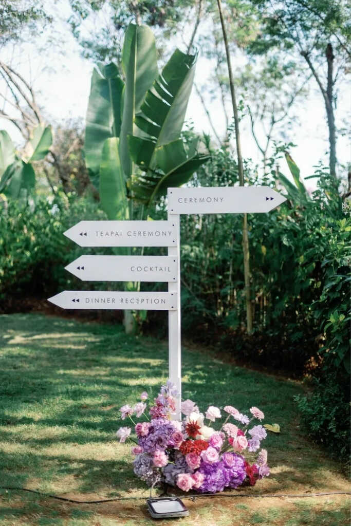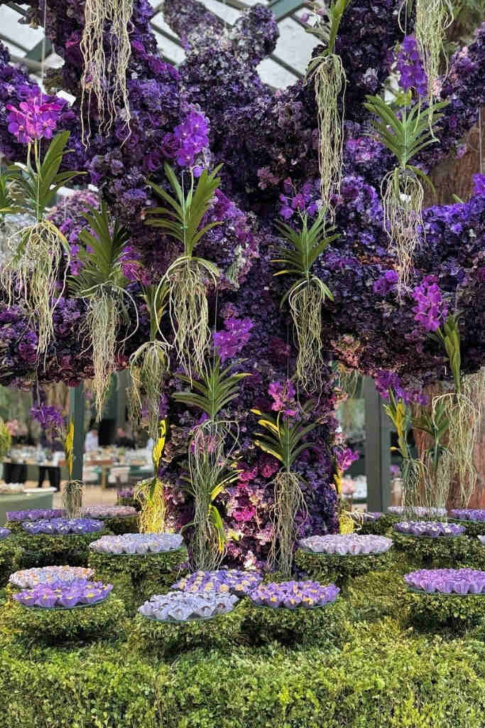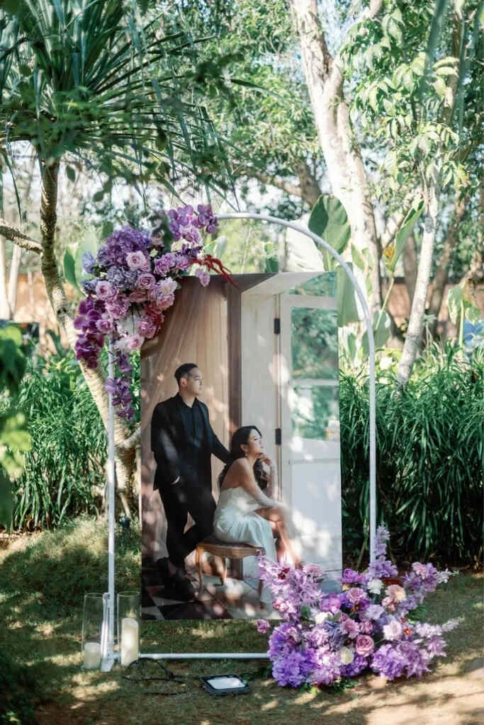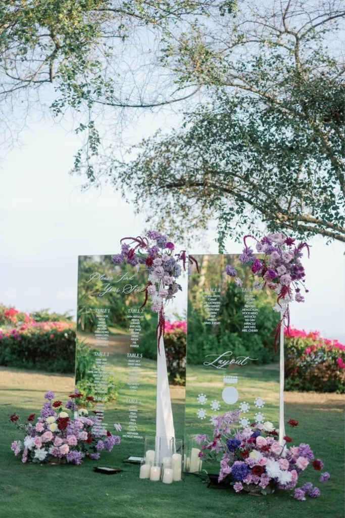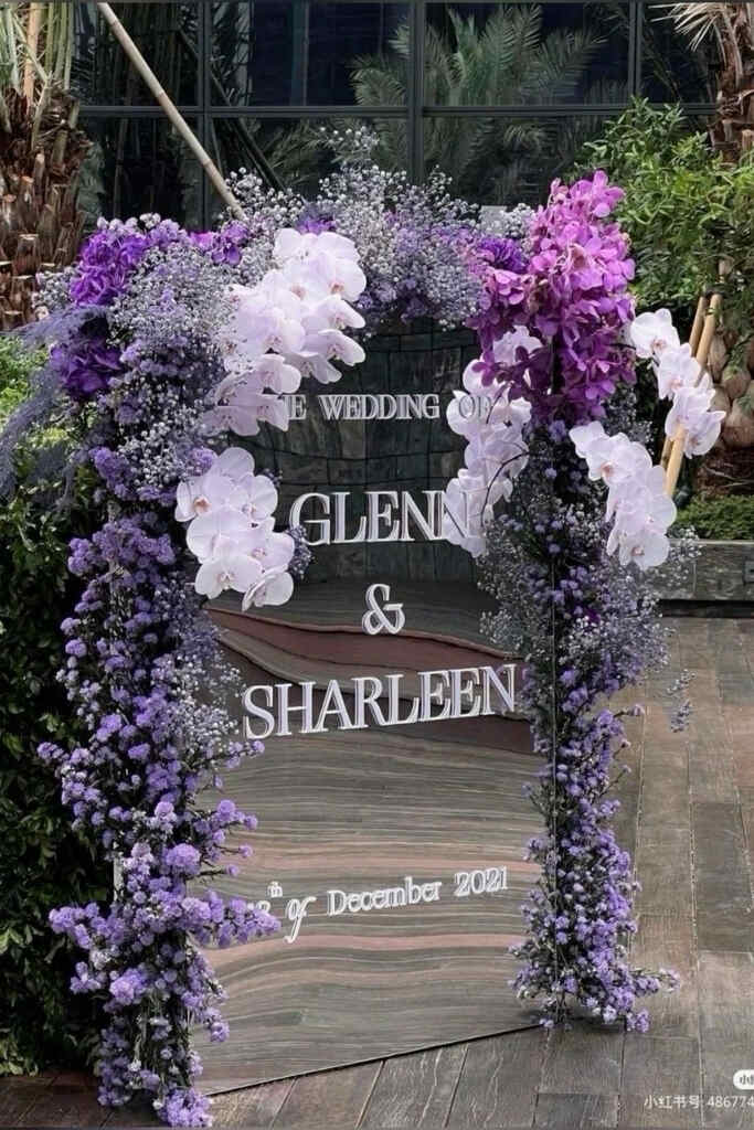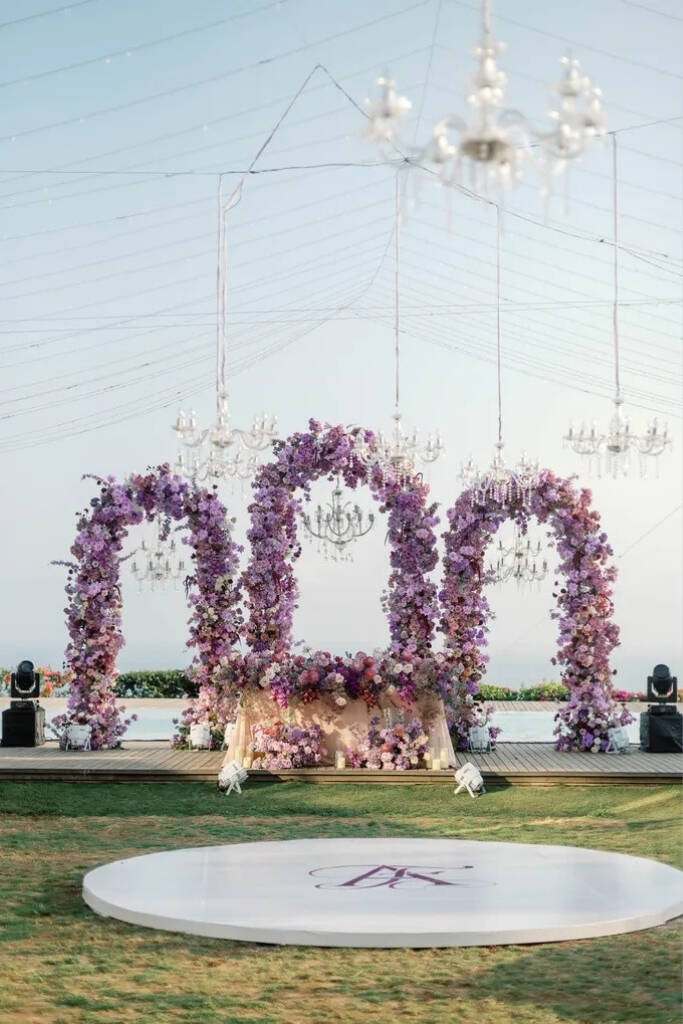 O roxo pode aparecer em diversos elementos da decoração, como painel de boas-vindas, centro de mesa, mesa do bolo, altar, caminho da noiva, lounge, tapetes, arranjos florais, espelhos decorativos e cantinhos instagramáveis.