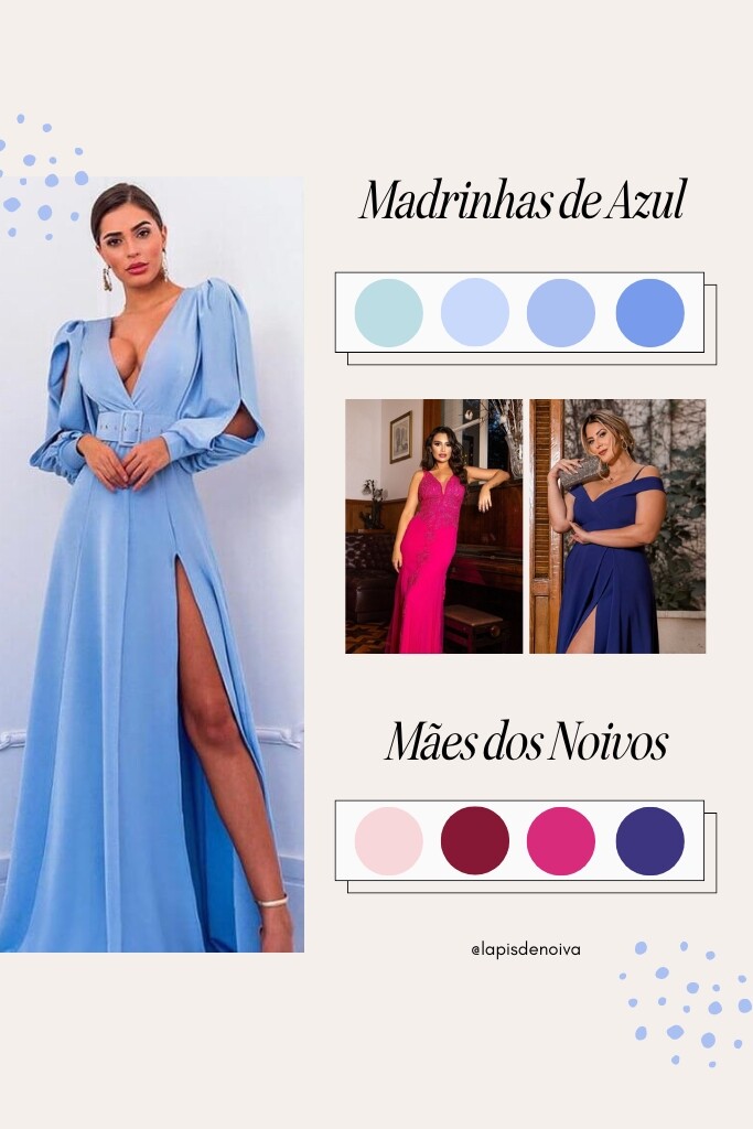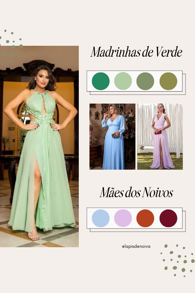 Não necessariamente. As madrinhas podem usar roxo ou outras cores que harmonizam com a paleta, como verde esmeralda, azul petróleo, butter yellow, sage green, dusty rose, lavanda, dourado, marsala, fúcsia ou lilás.