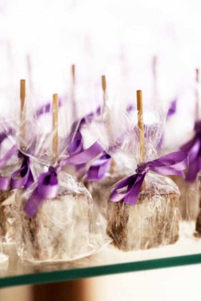 O roxo pode aparecer no convite no envelope, na estampa, em aquarela ou no lacre de cera. Nas lembrancinhas, basta incluir fitas ou tags na cor. Já no bolo e nos doces, a tonalidade pode surgir no topo do bolo ou na personalização dos docinhos.