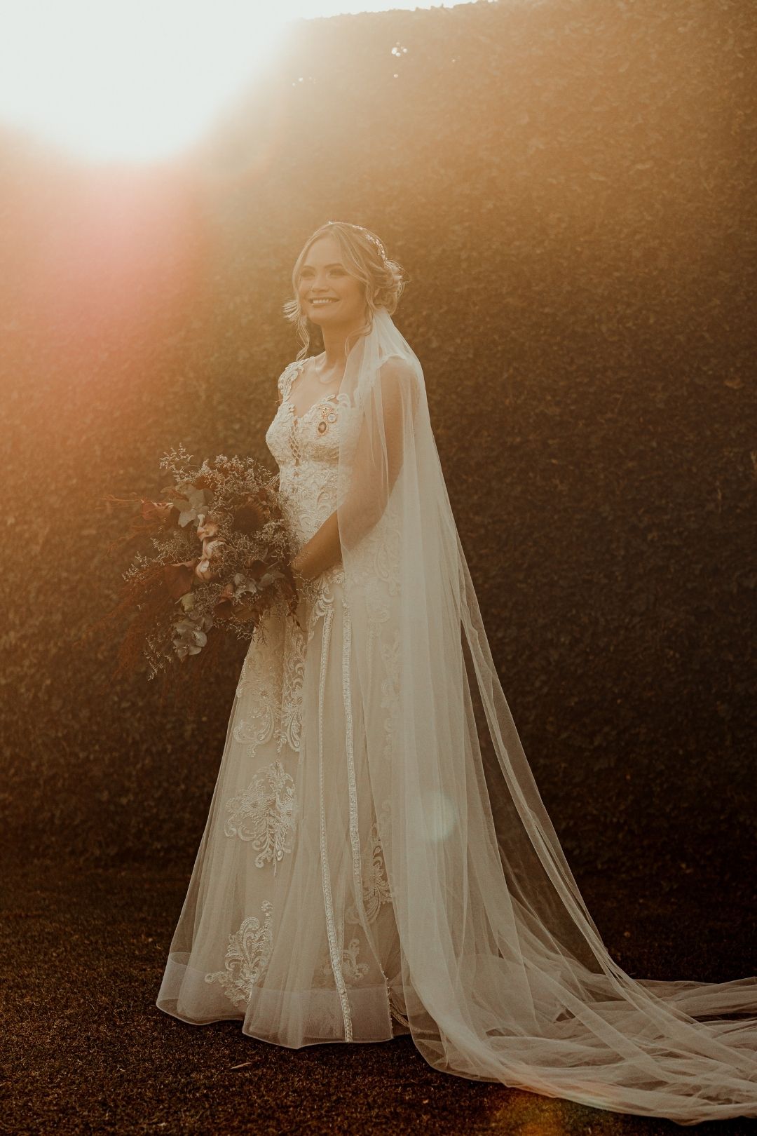 A decoração rústica em tons terrosos e azul criou um ambiente aconchegante perfeito e trouxe ainda mais destaque para o vestido da noiva.