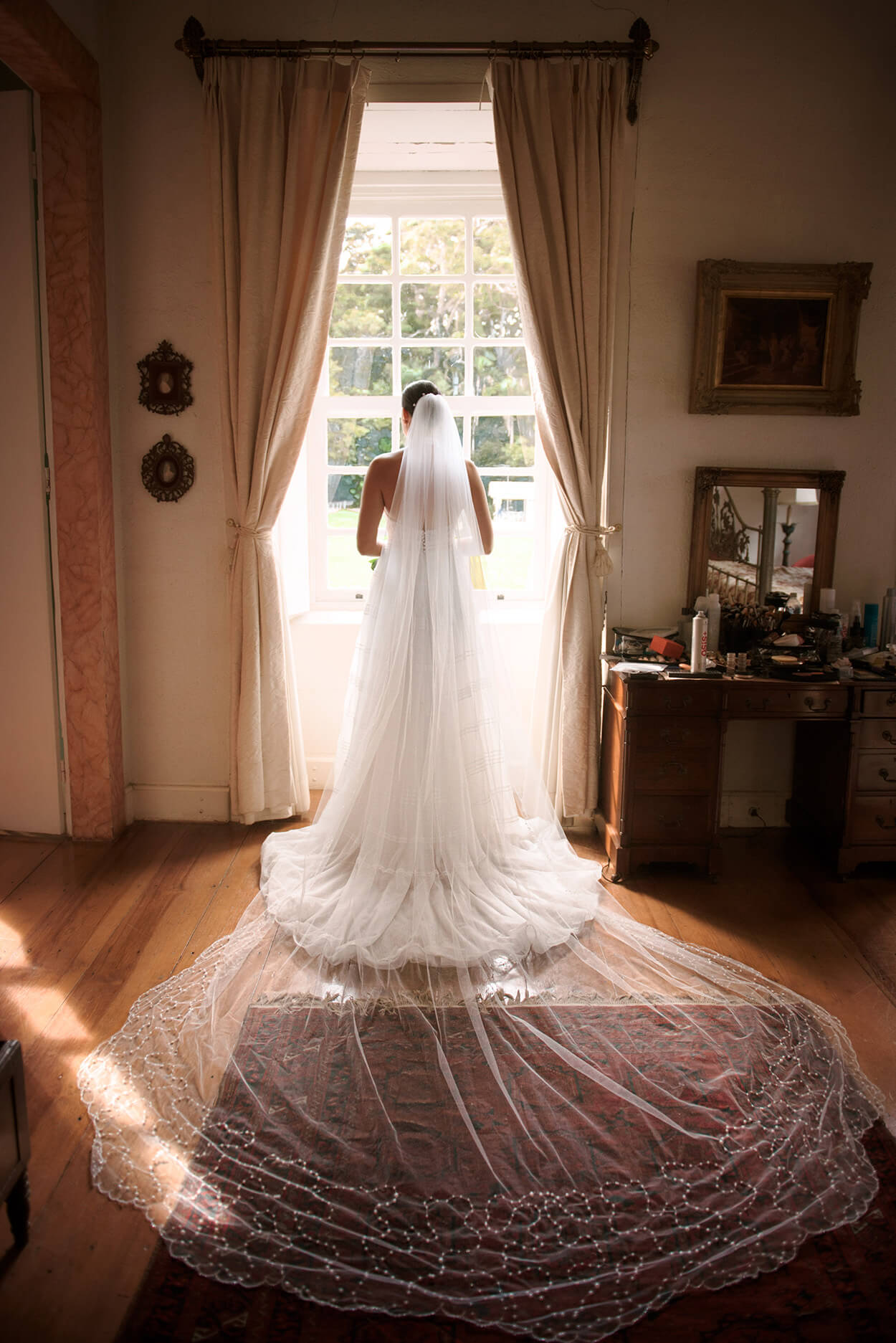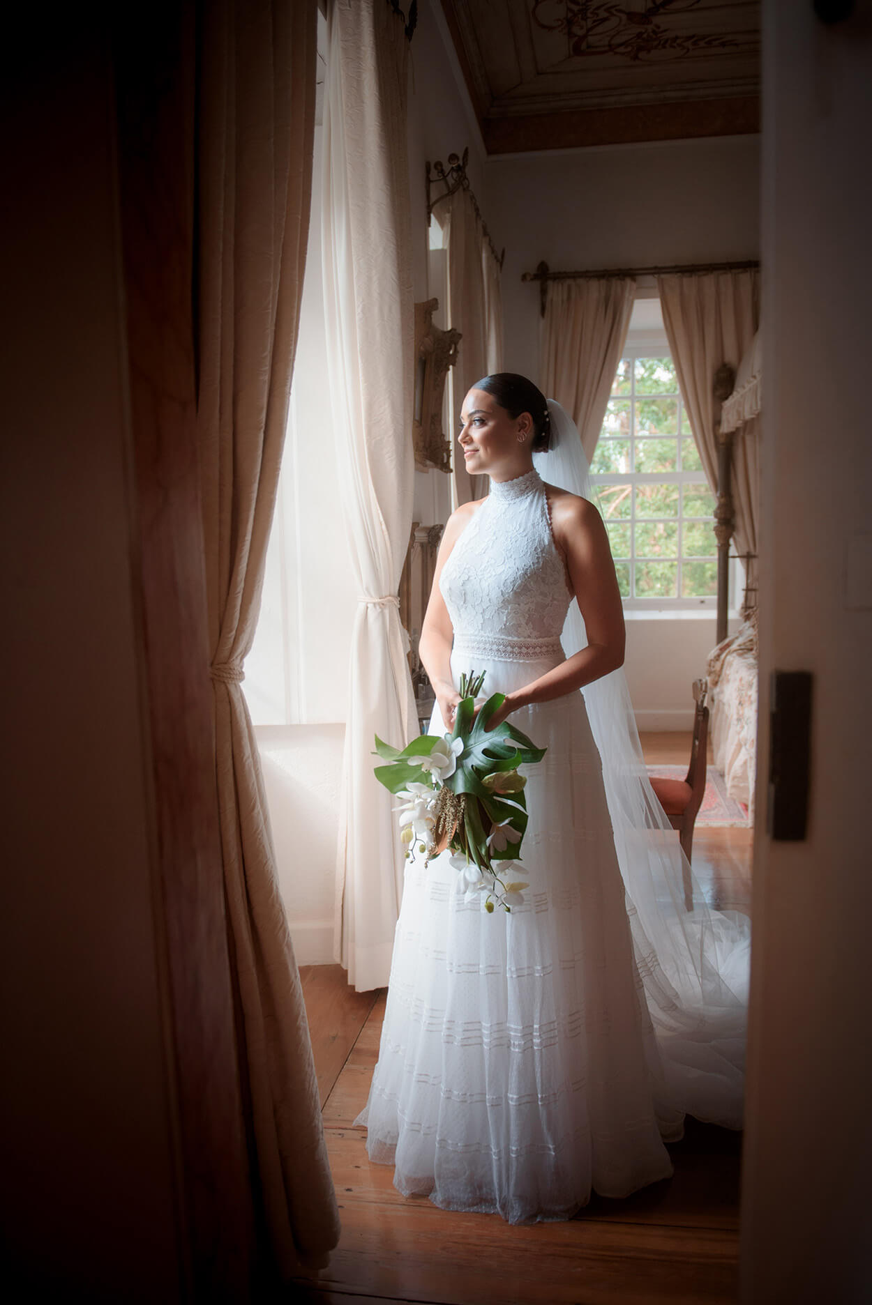 Ao escolher esse decote alto, o halter crop, a noiva destacou os ombros e aproveitou para chamar toda a atenção para o seu rosto. Esse vestido incrível combinou perfeitamente com o penteado chignon e véu com aplicação de pérolas.