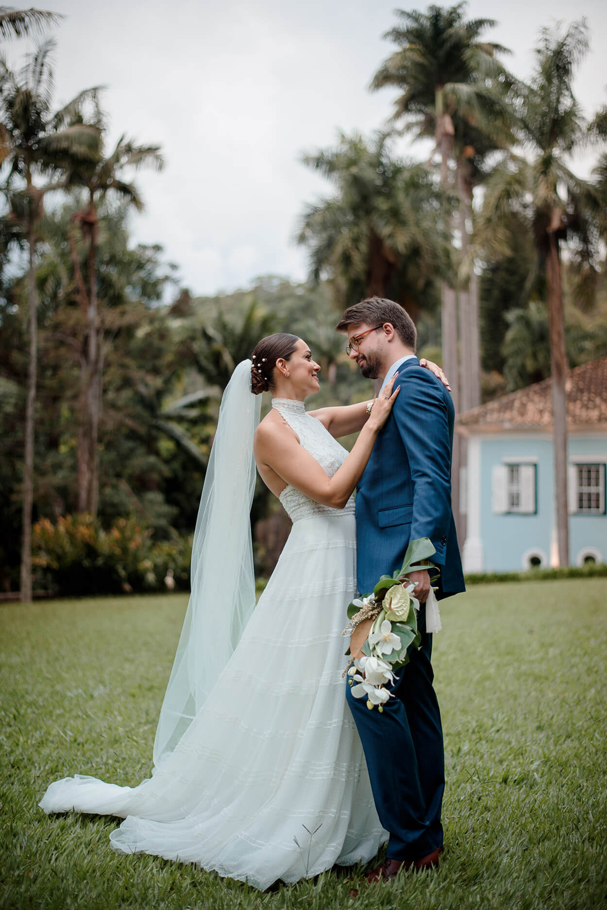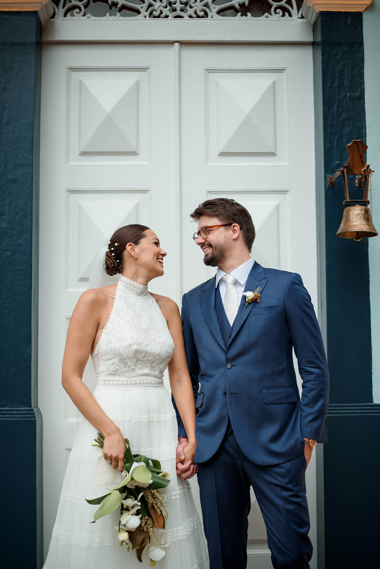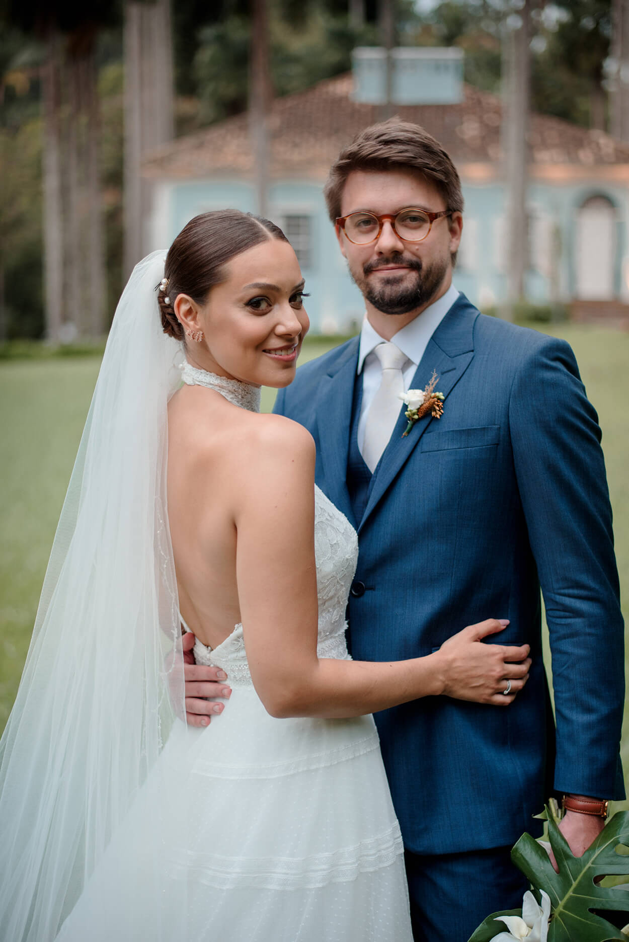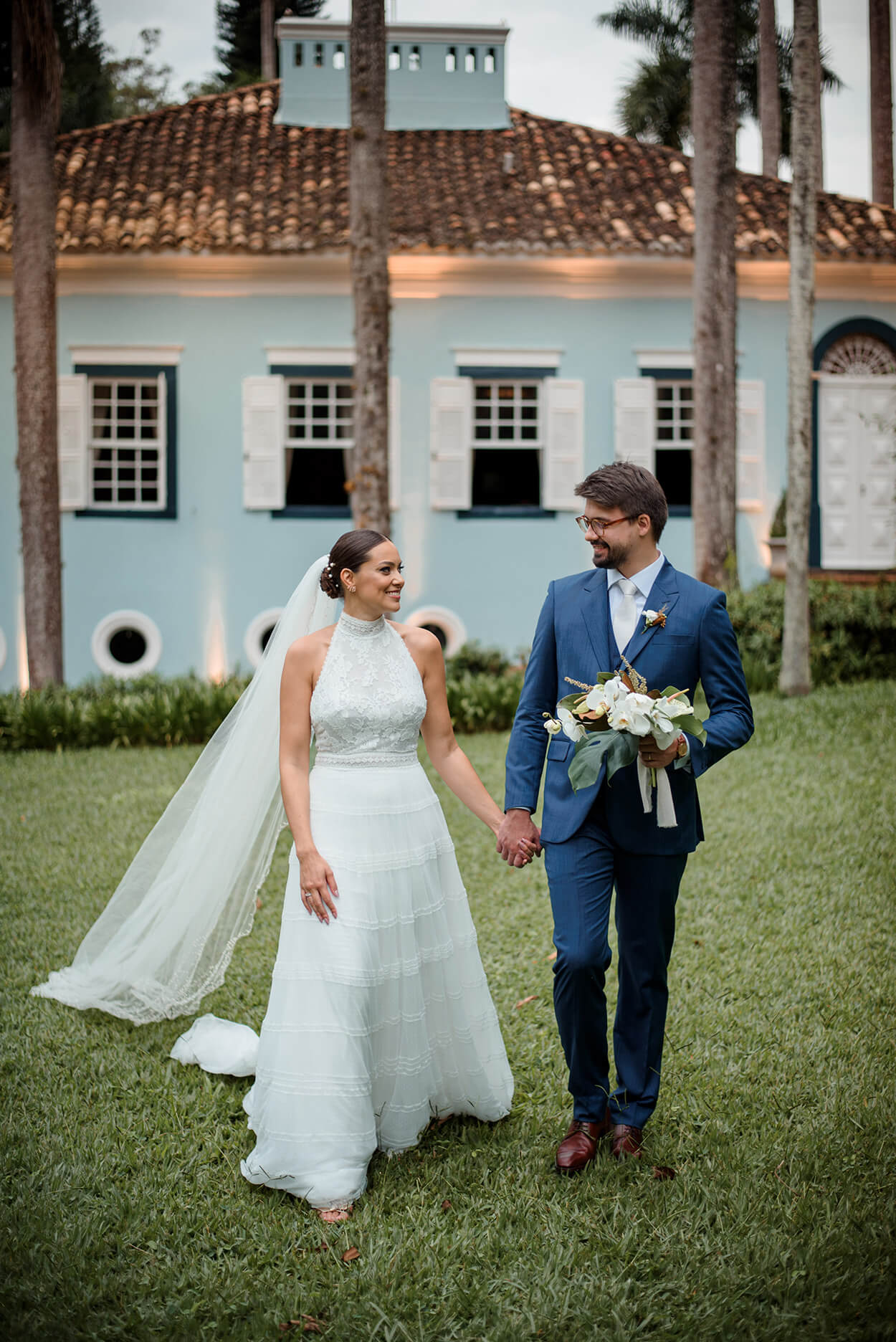 O noivo investiu em um terno azul, e não conseguimos esconder que esse tom é um dos nossos queridinhos! Também precisamos comentar sobre toda a harmonia dos acessórios do noivo e lapela com o buquê. Esses são detalhes fazem toda a diferença.