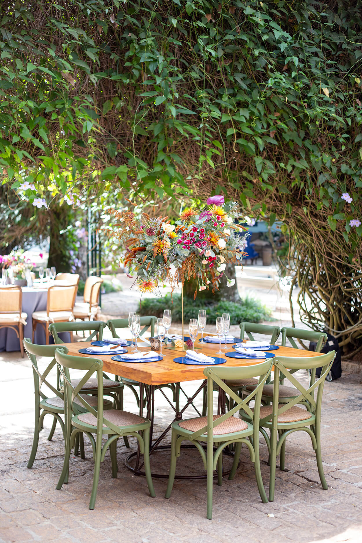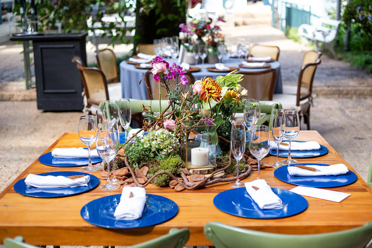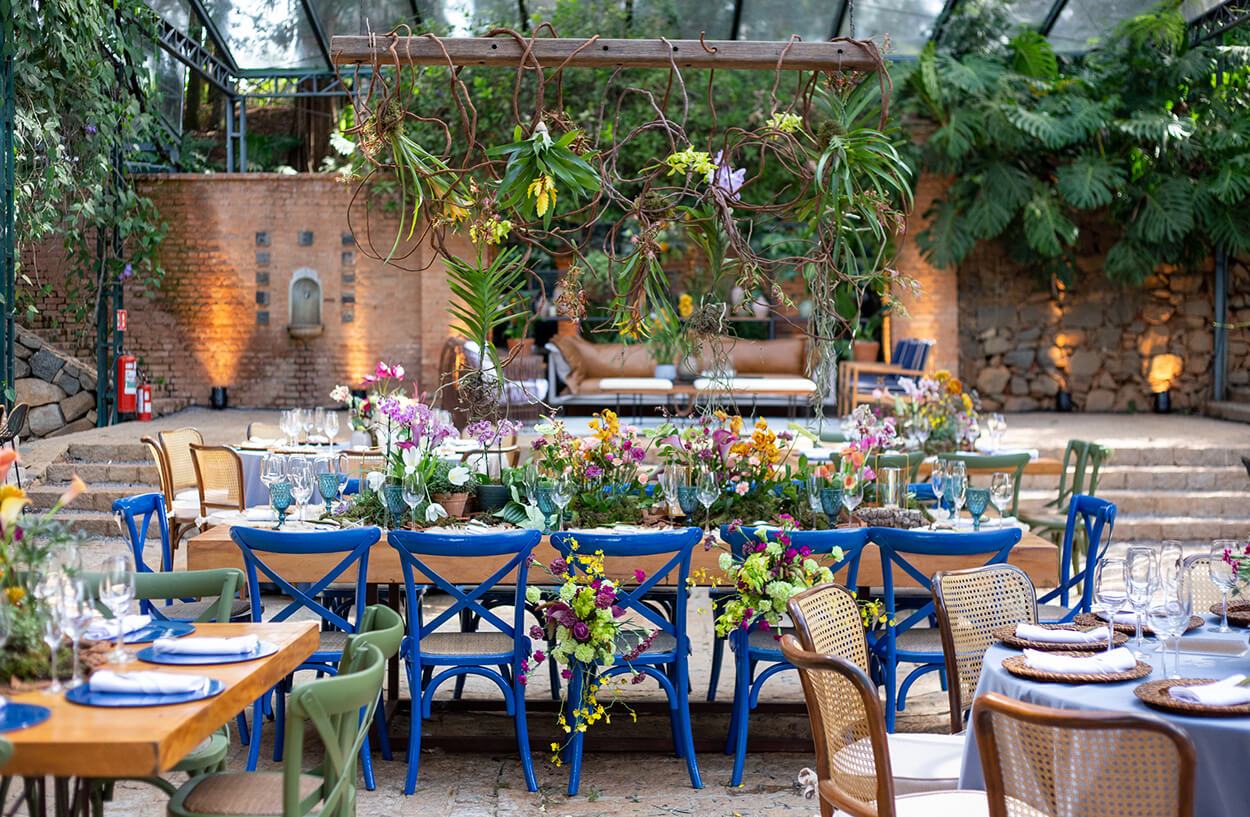 O casal surpreendeu ao escolher uma decoração boho com toques de azul vibrante. Adoramos a combinação de cores e texturas. Além disso, o projeto contou com lounges de tirar o fôlego e uma mesa de doces toda descontruída e bem orgânica, que harmonizou perfeitamente com a beleza natural da fazenda.