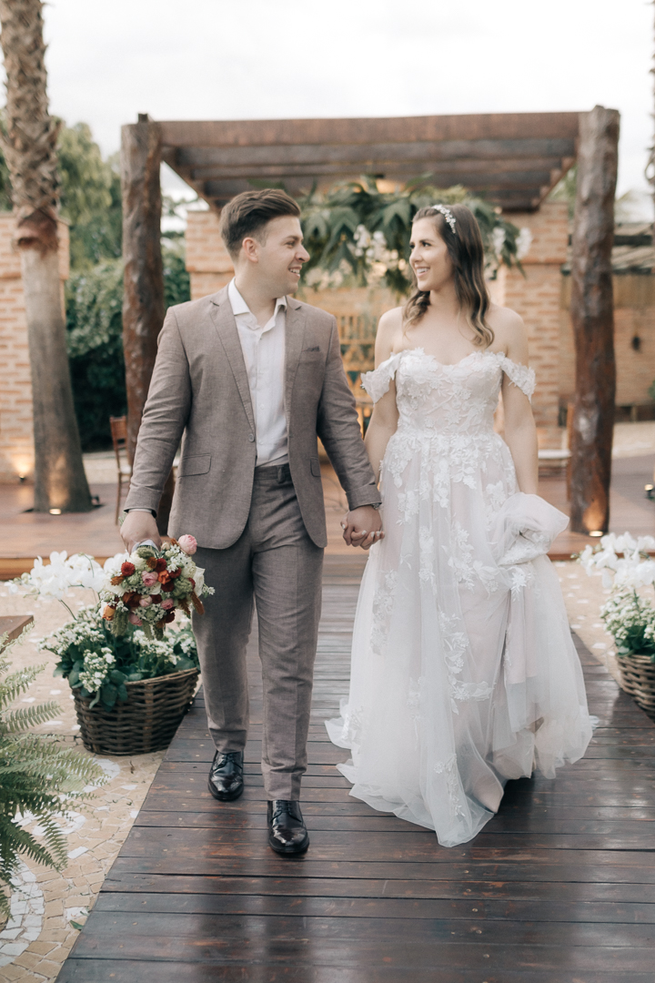 “Queríamos algo bem leve, romântico mais autentico.” Escolheram, junto com a Flor Brasileira, uma paleta na cor branco, rosinha, verde e nude. “Mas dei carta branca para a decoradora e fui surpreendida com uma decoração deslumbrante onde os capim dos pampas, eucalipto e as orquídeas bailavam.”