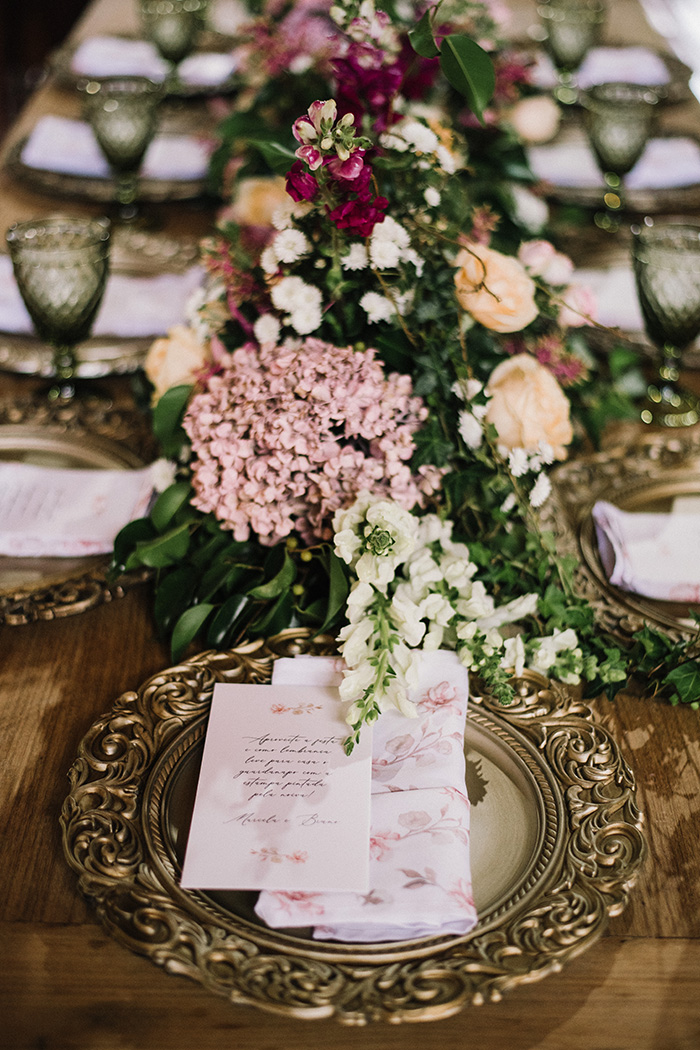 A decoração majestosa da Flores de Provence com um mix de estilo europeu, rústico chic e uma pitada vintage em tons de rosa sweet, verde e toques de marsala, só poderia receber elogios.