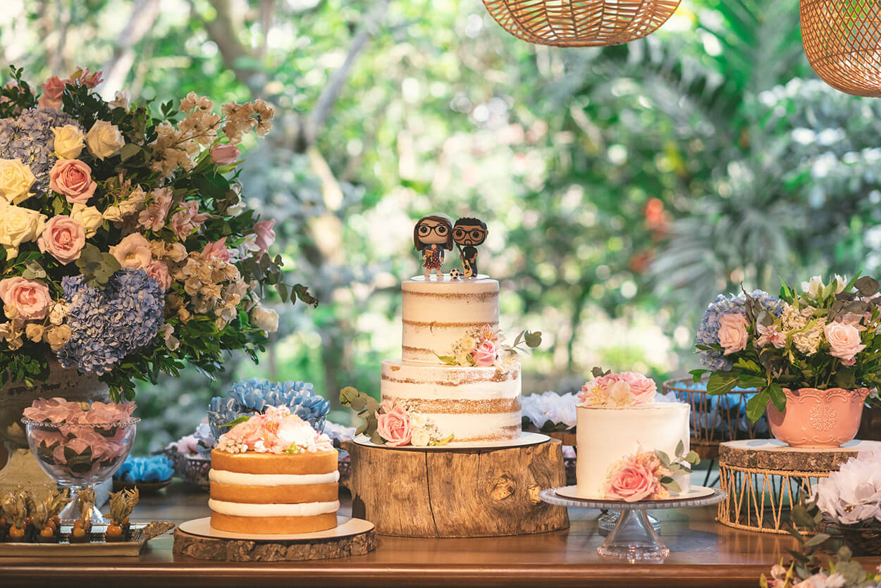 A Sweet Wedding Decor caprichou em cada detalhe. A mesa do bolo nos entrega a paleta de cores romântica clássica: branco, rosa e azul.
