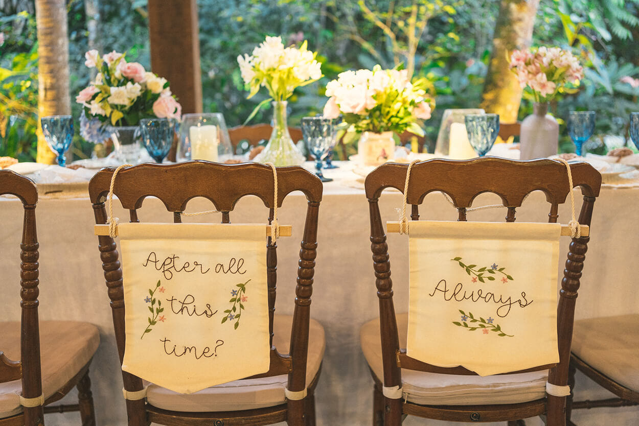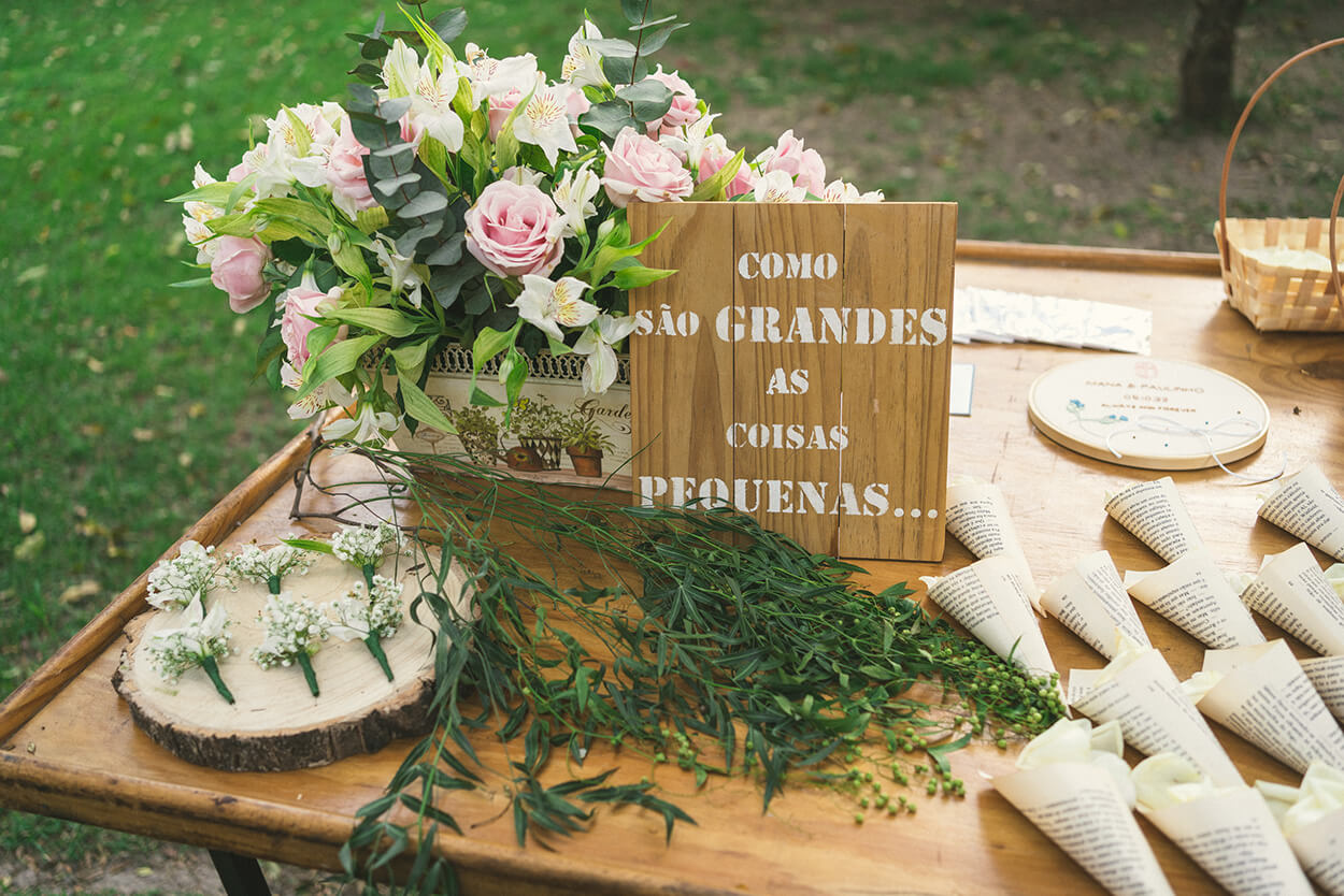Mas, o rústico não fica por conta apenas do espaço, afinal, podemos notar vários detalhes simples e charmosos, como o porta alianças bordado. Outro item que quase passa despercebido são os cones com as pétalas. Uma graça!