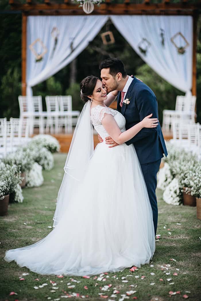 Eles são um casal muito fofo, e respeitaram as vontades um do outro na hora de organizar o casamento. Ela, mais romantica, escolheu um vestido de renda e saia fluida da NatKat Bridal, e complementou o look com véu e acessório de cabelo num chignon baixo e elegante. Ele, geek de carteirinha, incluiu vários detalhes na decoração, como o topo de bolo de Star Wars.