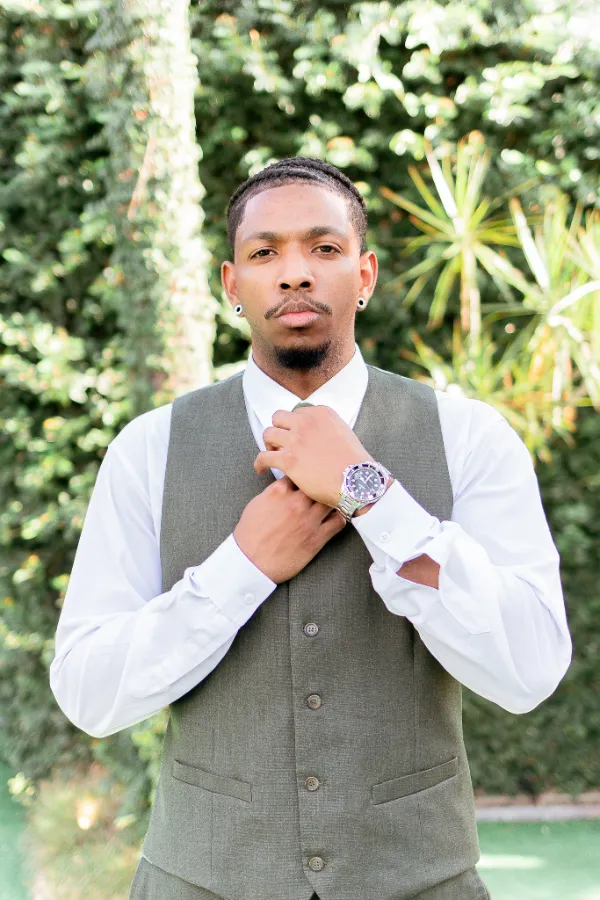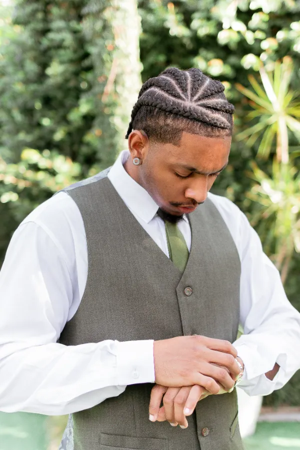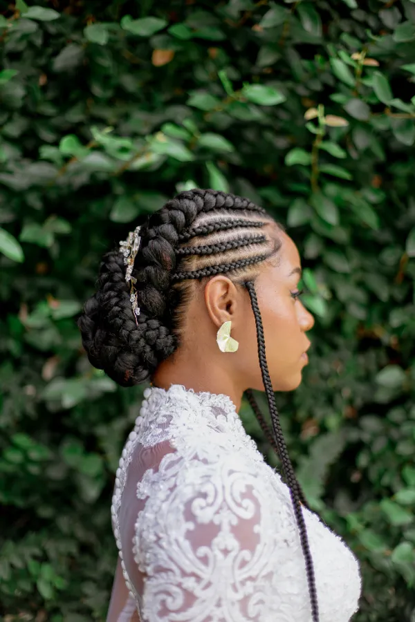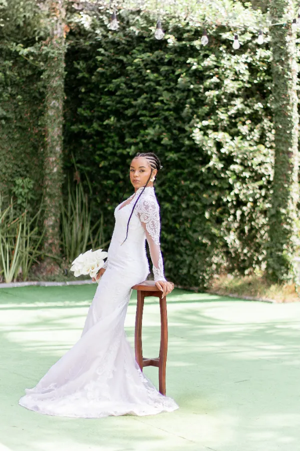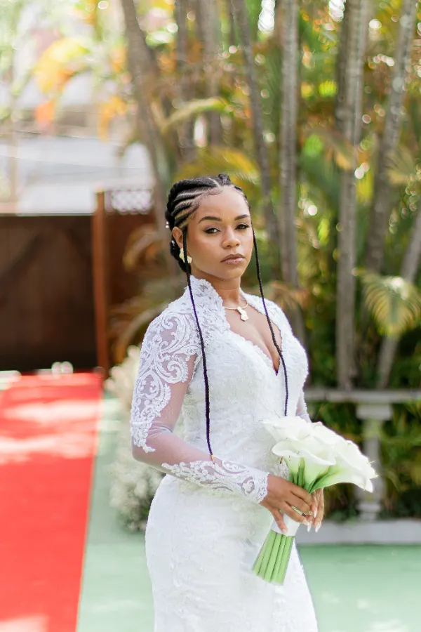 O vestido da noiva, o terno do noivo e os cabelos foram pensados para valorizar a raiz negra, trazendo identidade, orgulho e representatividade.