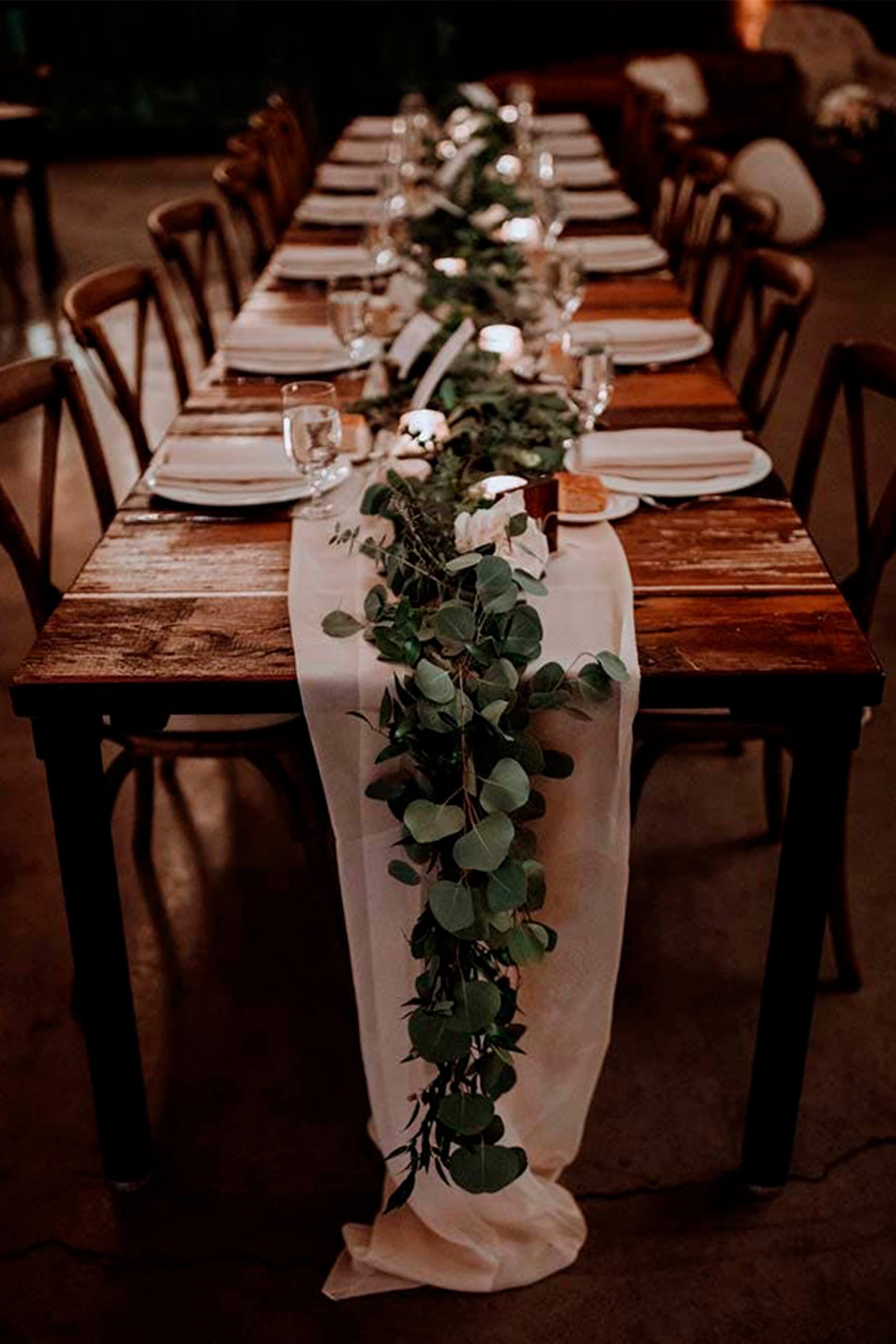 Os centros de mesa para casamento rústico tem aquele toque da natureza. No caminho de mesa, ramos de folhas e flores podem ser colocados juntamente com velas, lamparinas, vidros e bolachas de madeira e troncos.