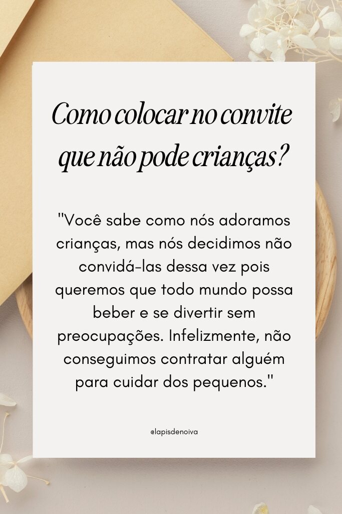 Voltar para o índiceEnvie um cartão extra junto do convite de casamento avisando de forma clara, porém firme. “Organizamos com carinho nossa festa somente para adultos pelos motivos A e B, portanto não será o ambiente ideal para crianças. Agradecemos pela compreensão!”