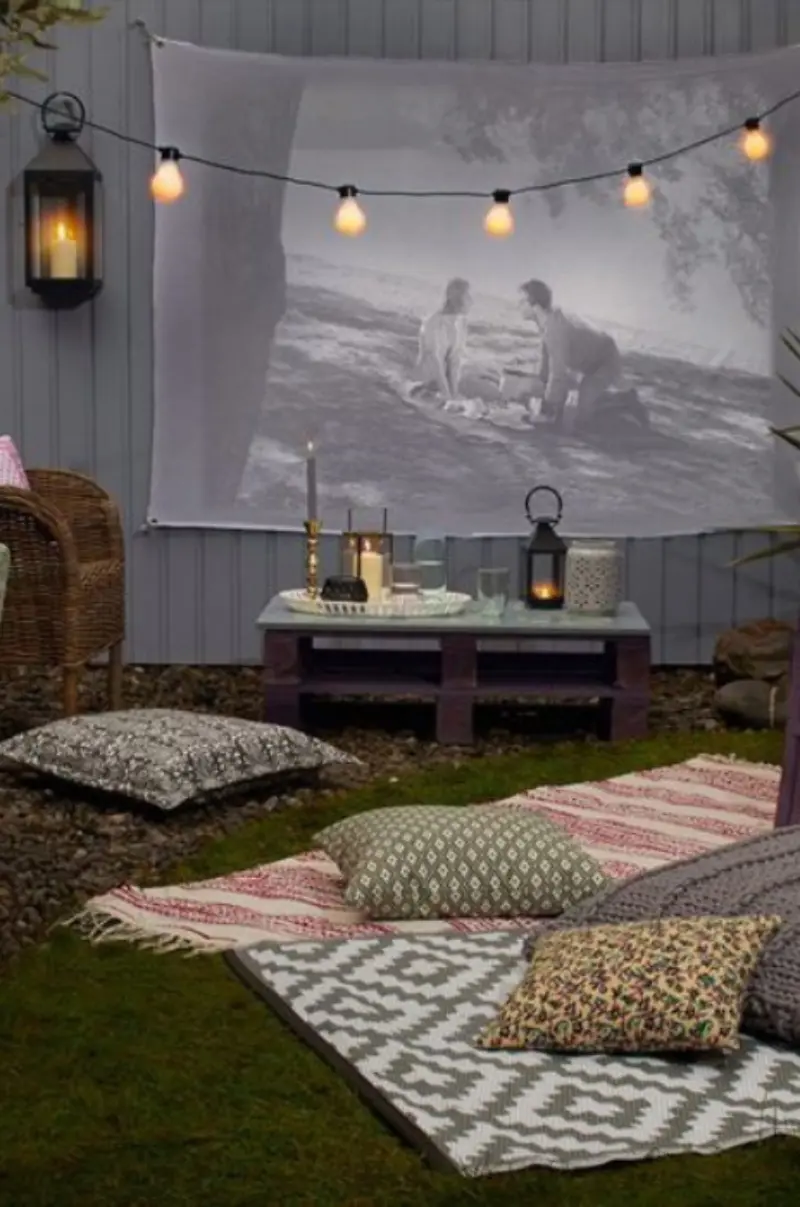 Uma ideia pra lá de aconchegante que promete encher os olhos do seus convidados é o cinema ao ar livre. Crie um ambiente despojado com assentos confortáveis, escolhe um filme de amor e sirva pipoca para uma experiência ainda mais inesquecível.