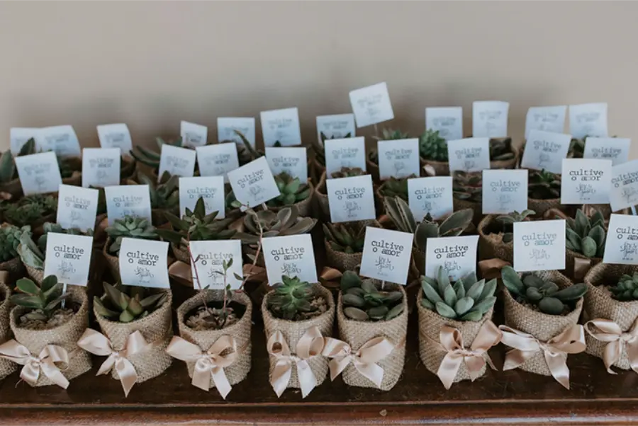 Suculentas, temperos em vasinhos, mini velas e bem-casados são opções simples, econômicas e que reforçam o clima leve e acolhedor da celebração.