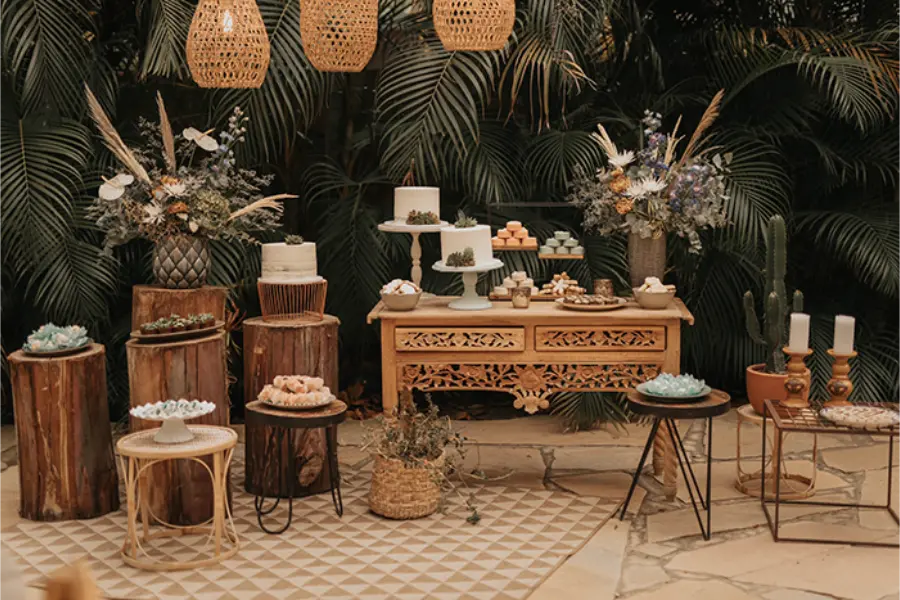 Invista em DIY na decoração, prefira cardápios práticos como finger foods ou buffet, e use a própria beleza natural do espaço para gastar menos com ambientação.