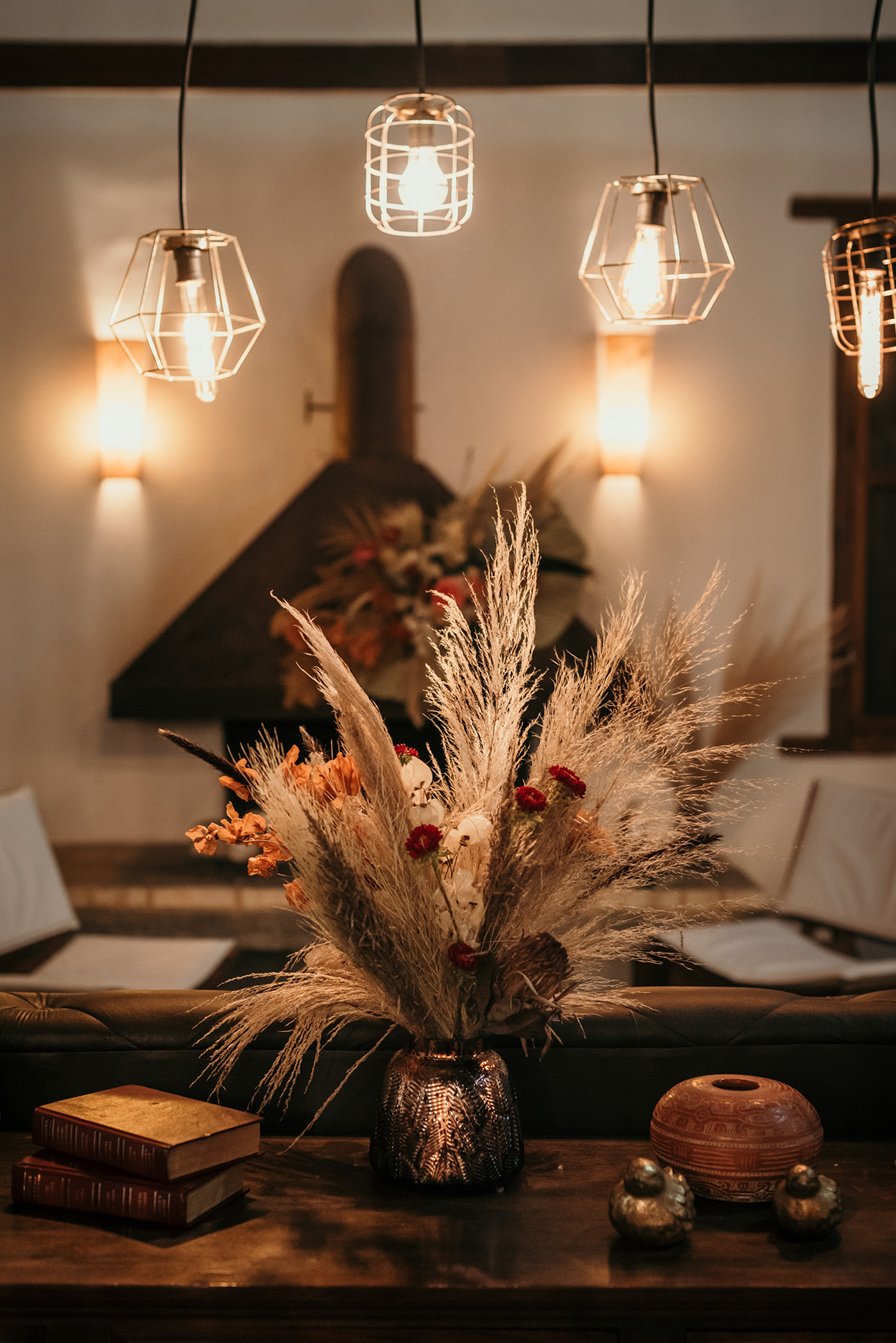 O cenário ganhou uma decoração com um mix de boho, industrial e minimalista. A noiva queria produzir a menor quantidade de lixo possível. Então, optaram por poucas flores, flores desidratadas que poderiam ser reutilizadas, docinhos sem forminhas, convites online. Aliás, identidade visual, save the date virtual e os convites foram feitos pelos noivos.